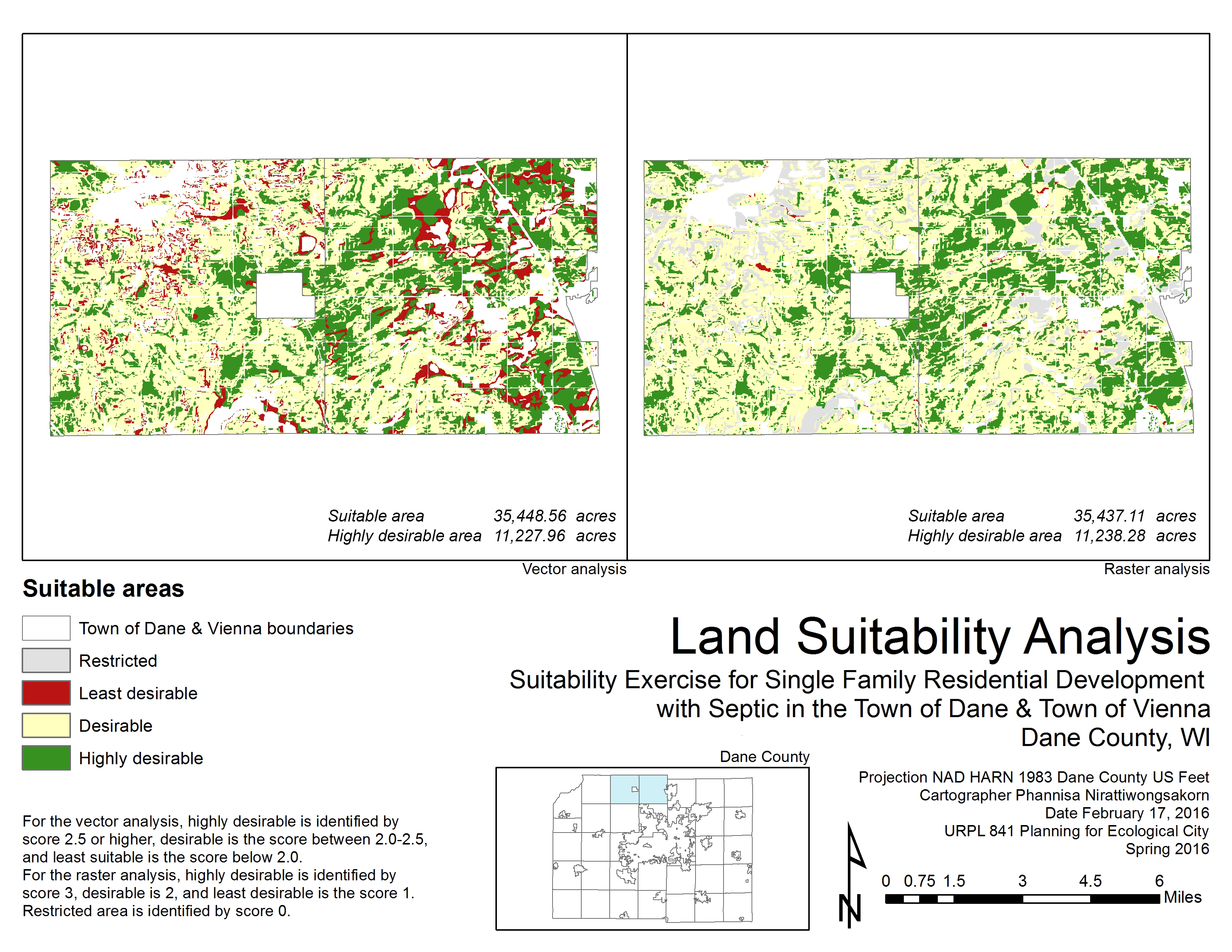 A spatial analysis performed by ArcGIS to find the best sites for a new residential development in Town of Dane and Town of Vienna, Dane County, WI with weighted criteria of: