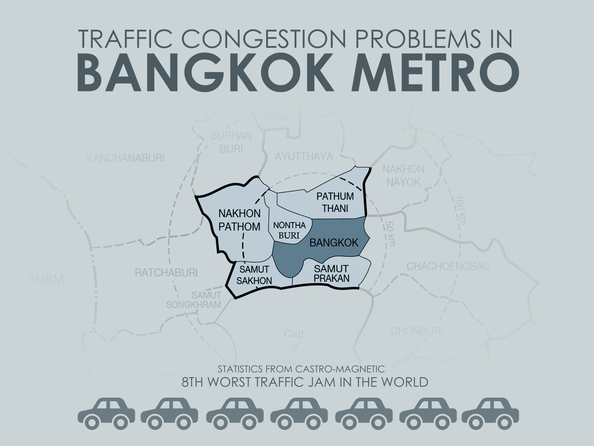 The causes of congestion problems in Bangkok Metropolitan Area can be divided into 4 main issues: number of private vehicles, inefficiency of road system planning compared to cities in developed countries, lack of regional transportation policy, and fragmented governance between Bangkok City and five adjacent provinces. Each of them will be discussed one by one.