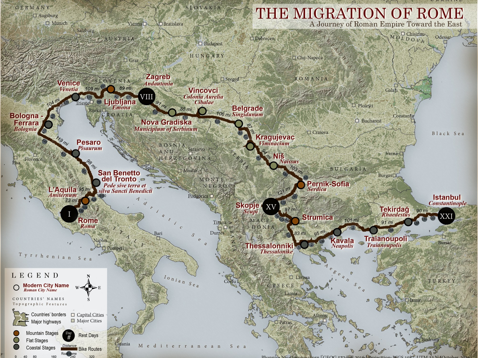 A new Tour de France route proposal from Rome to Istanbul, mimicking the migration route of the Roman Empire from Roma to Byzantium which later has become Constantinople and Istanbul respectively. The route is approximately 1700 miles in total with 21 stops and 3 stages – flat, mountain, and coastal. All stops are cities where were a part of Roman Empire. Bikers will feel like a part of the migration caravan, all history lies in the route.
