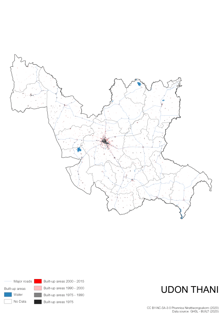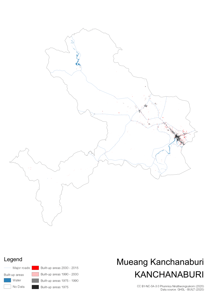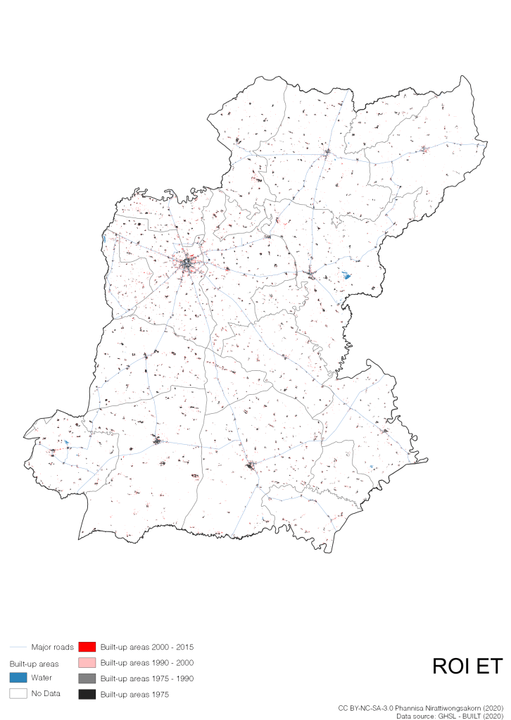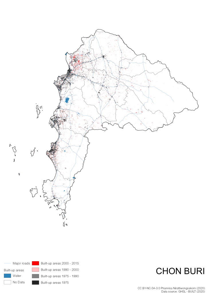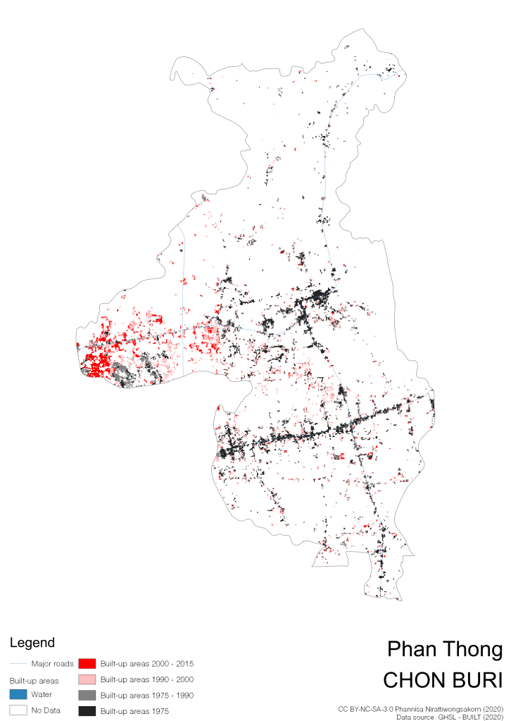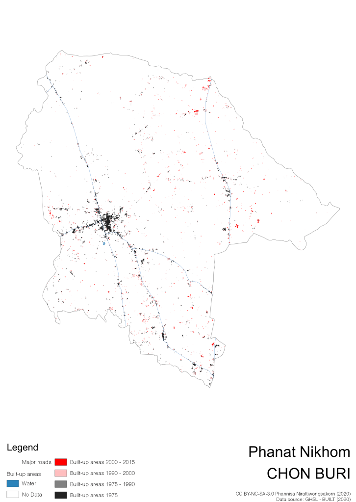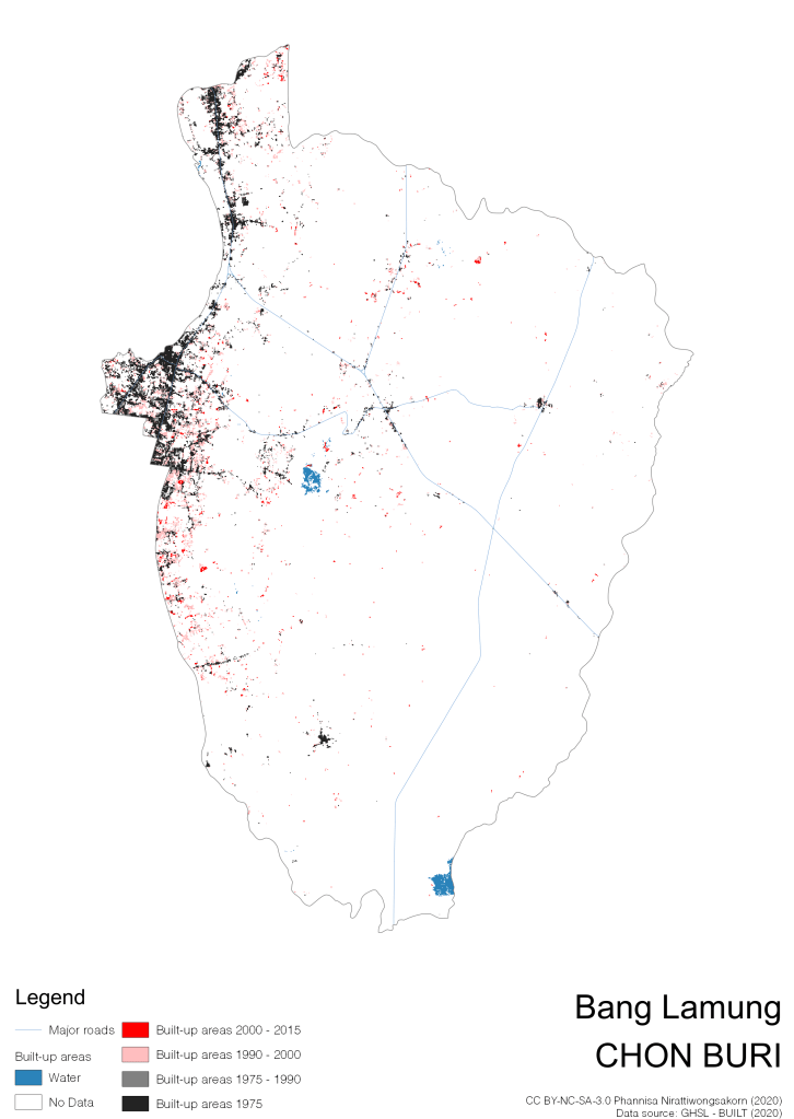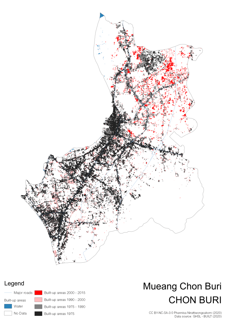 I visualize built-up areas of the 4 periods: until 1975, 1975 – 1990, 1990 – 2000, and 2000 – 2015, by province, and by district (Amphoe). Here you will see different urban patterns of the selected cities.