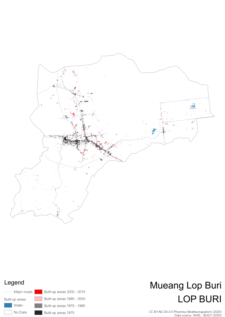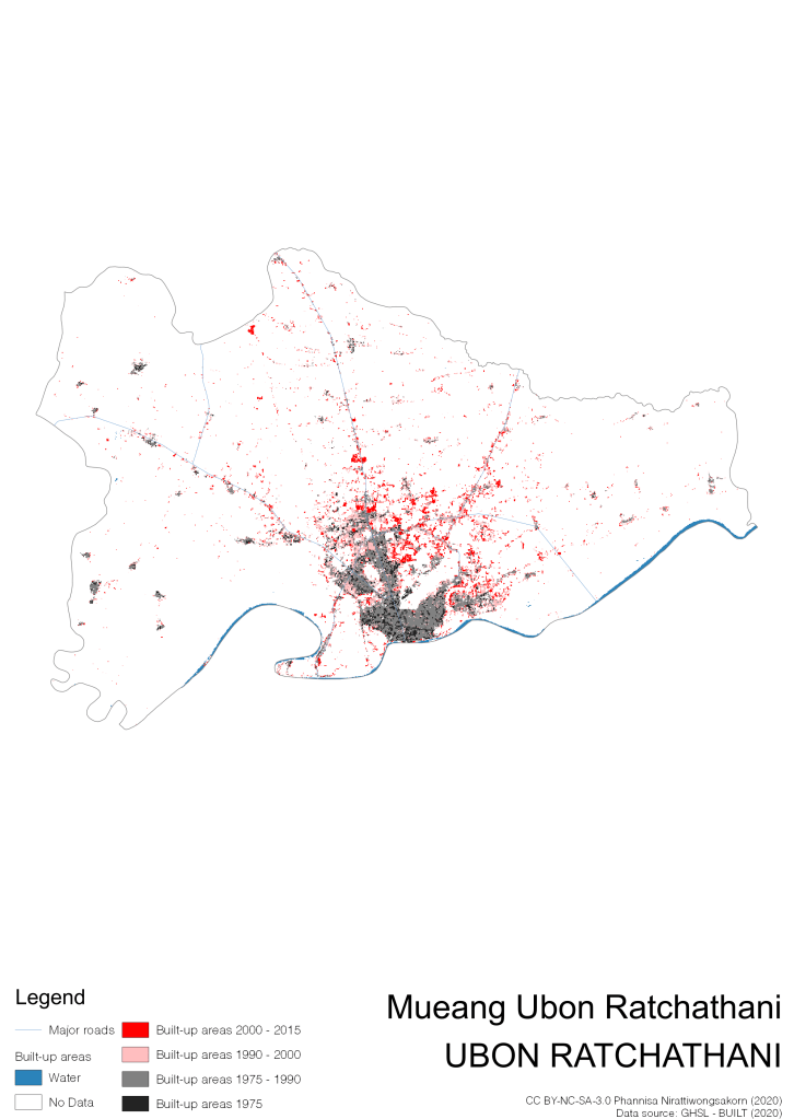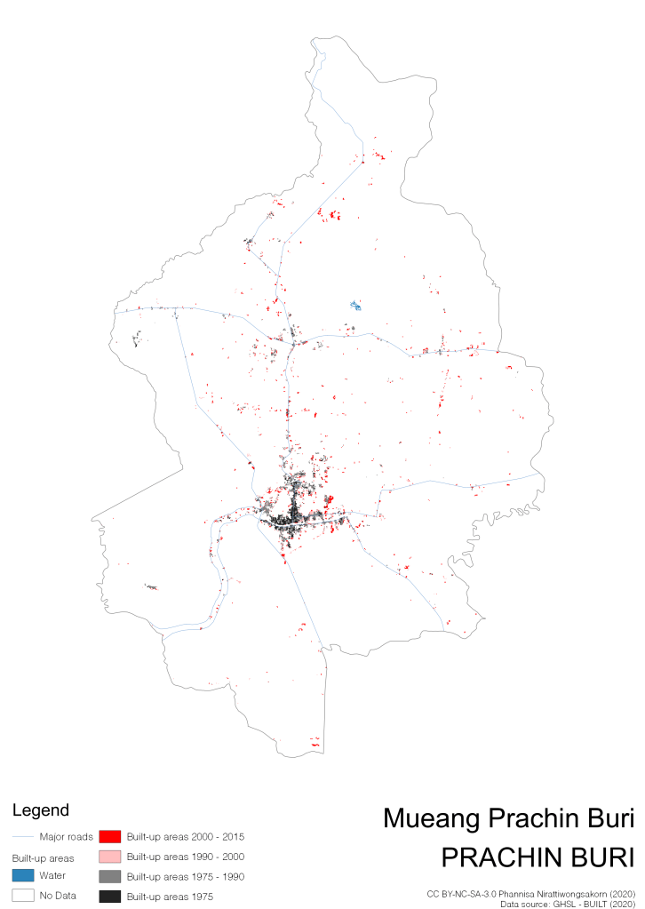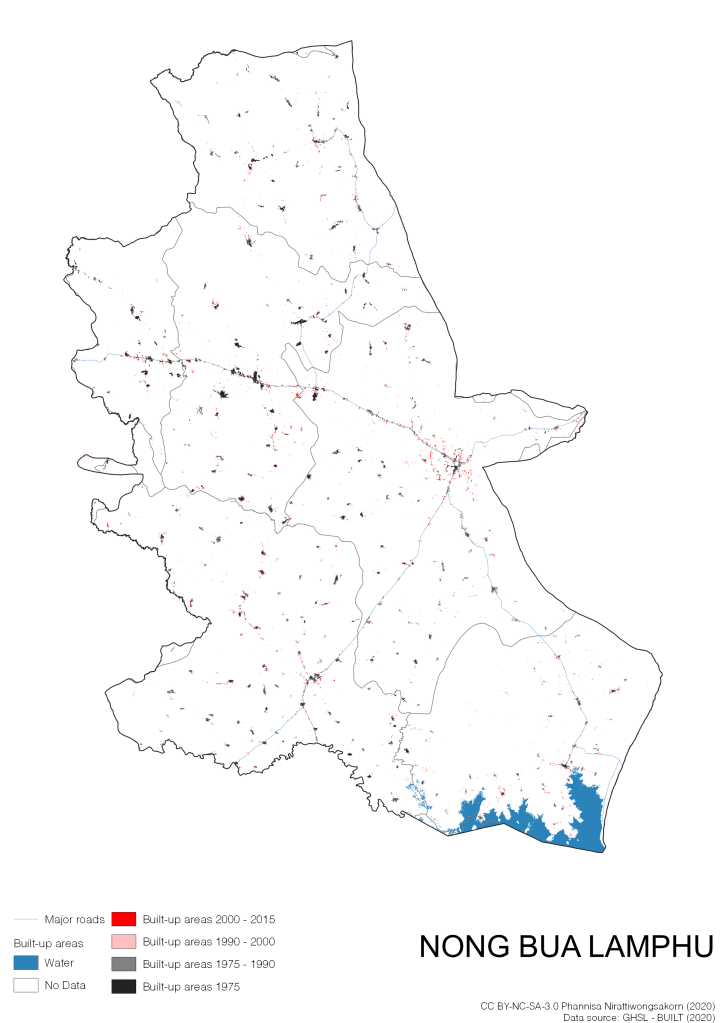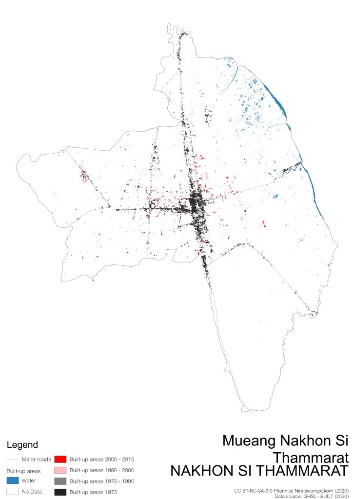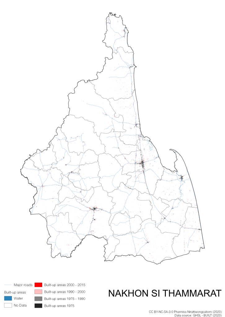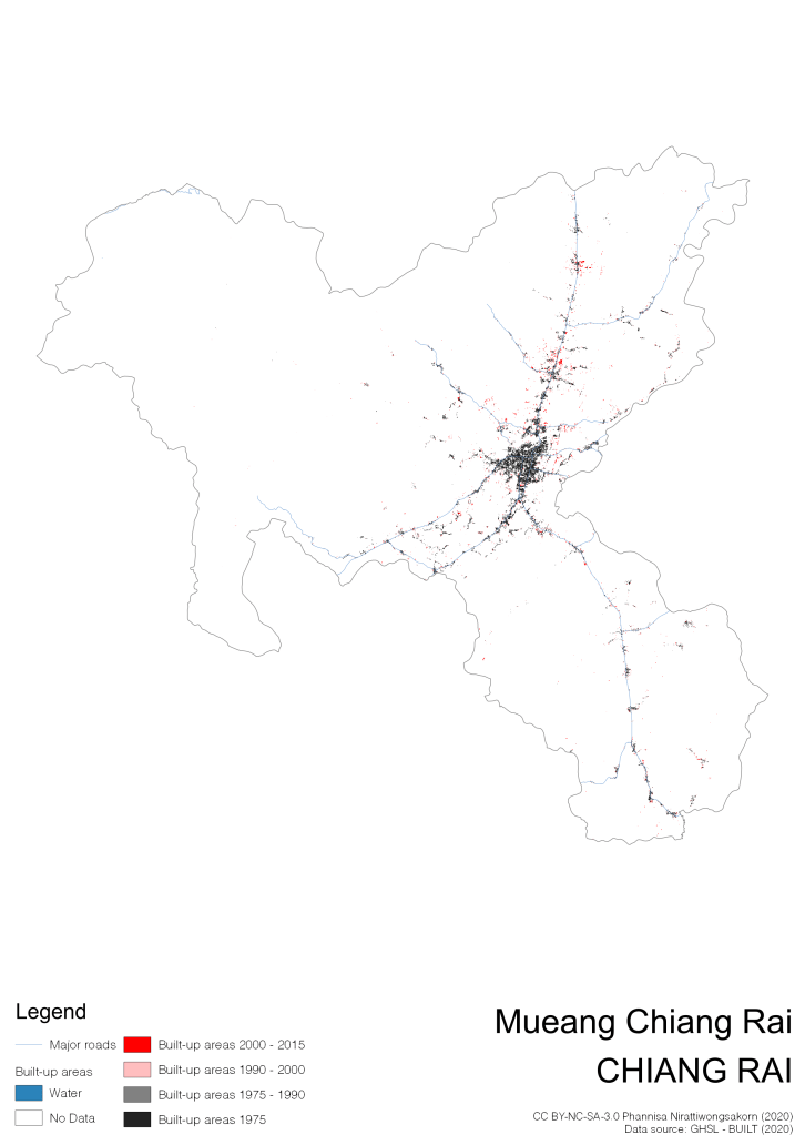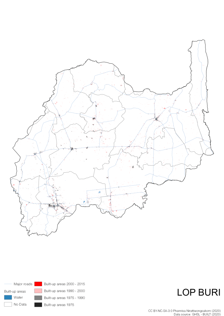 I visualize built-up areas of the 4 periods: until 1975, 1975 – 1990, 1990 – 2000, and 2000 – 2015, by province, and by district (Amphoe). Here you will see different urban patterns of the selected cities.