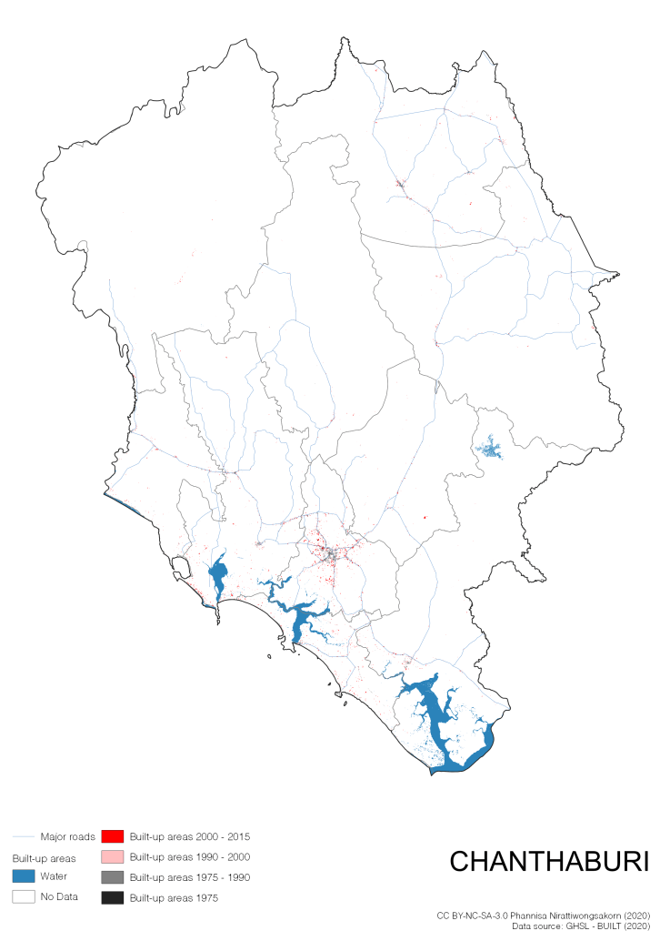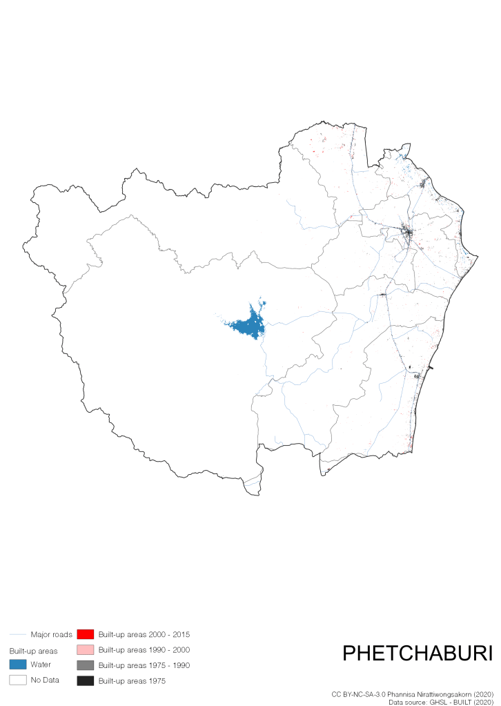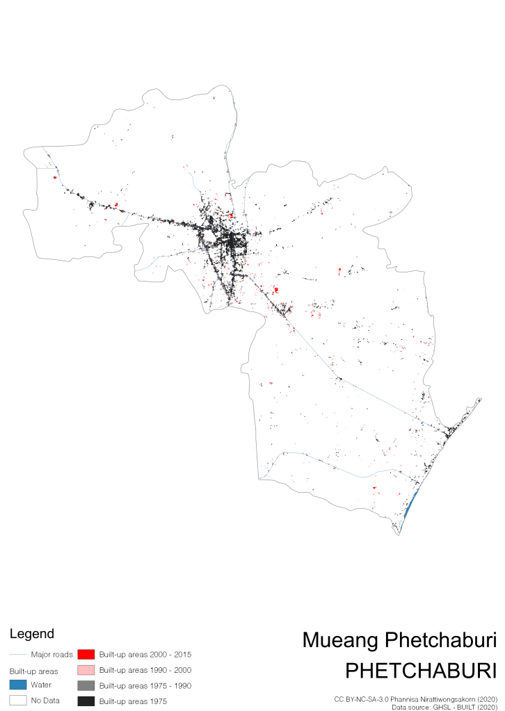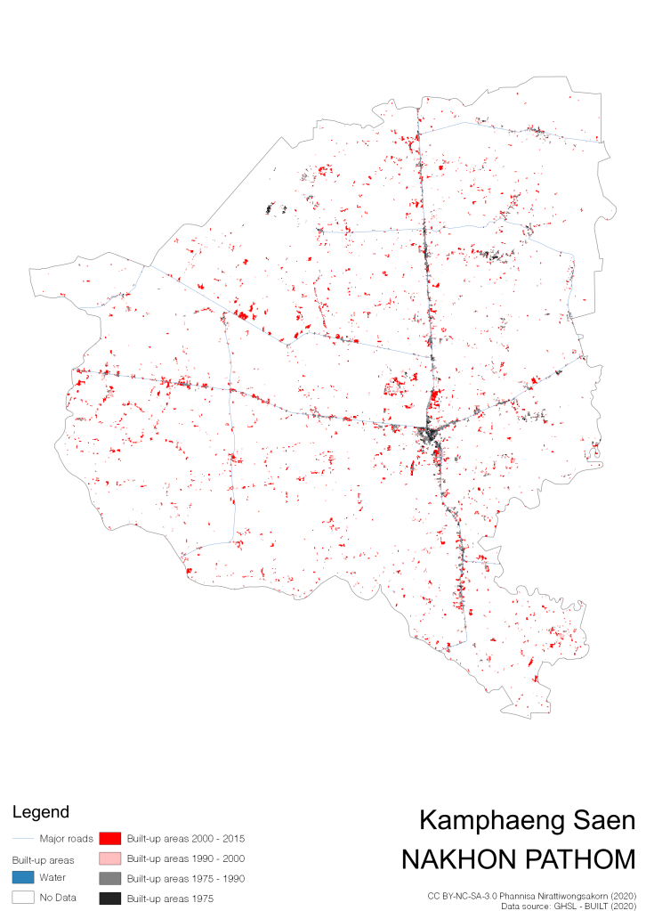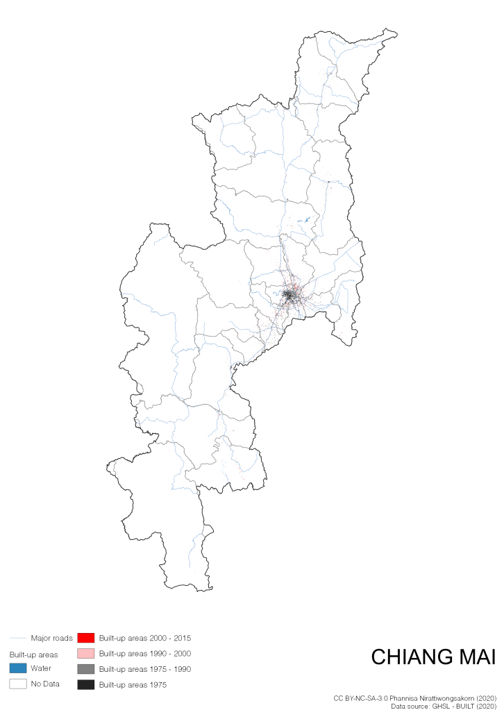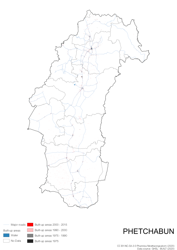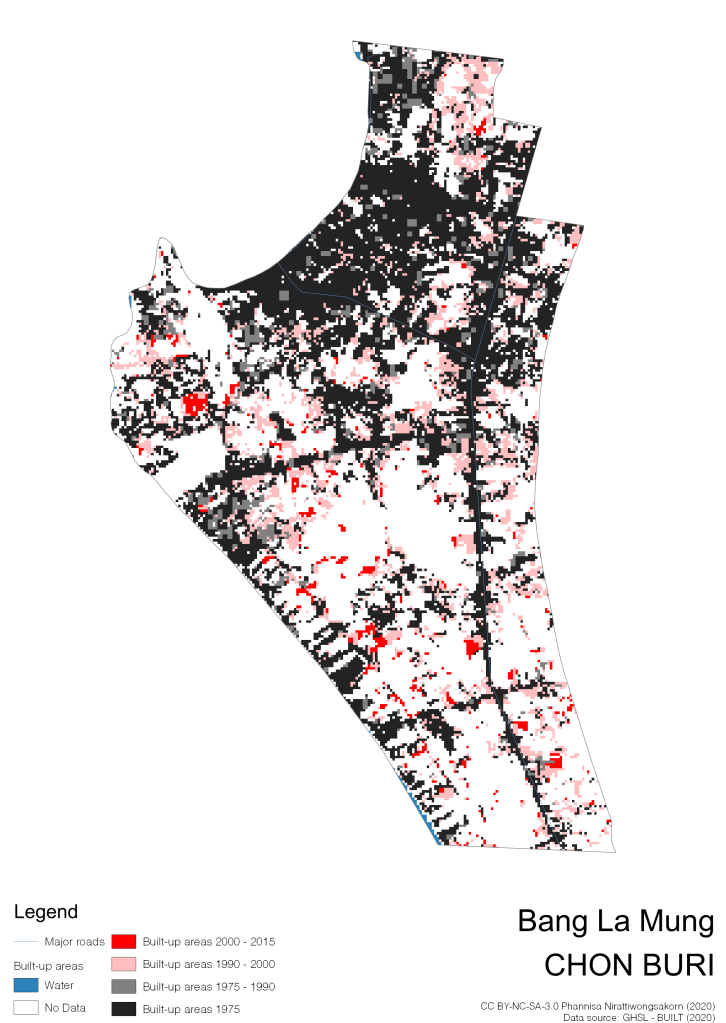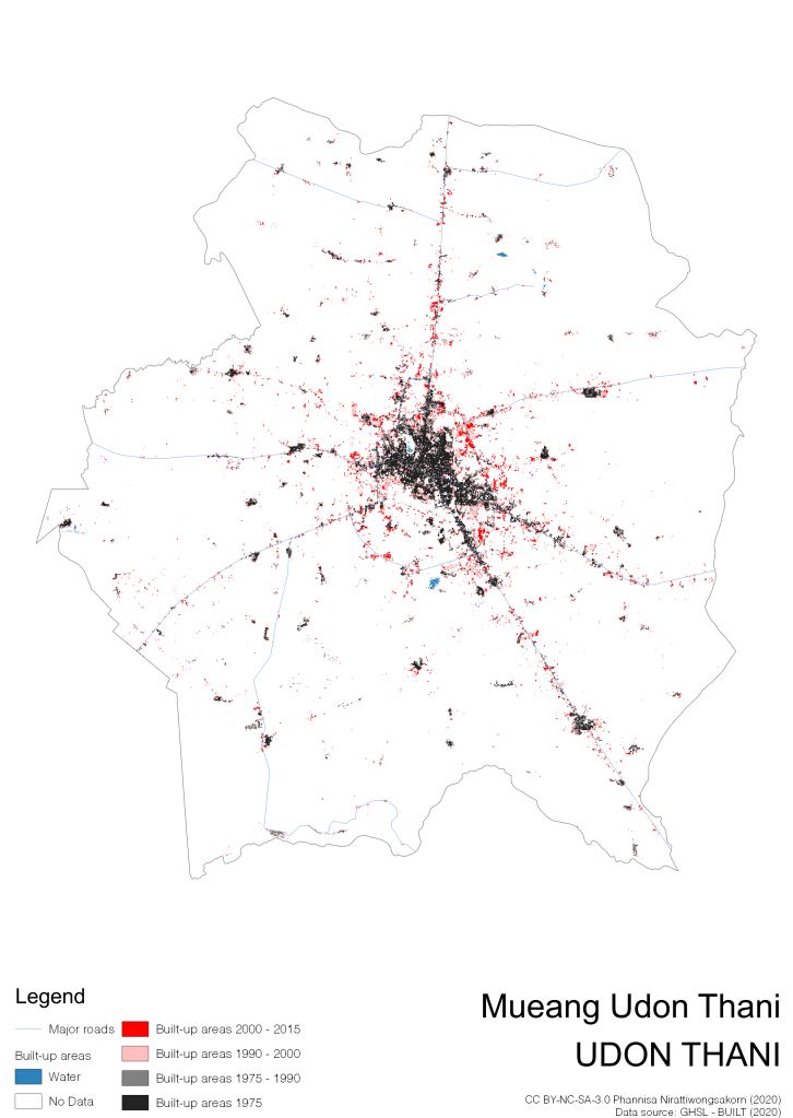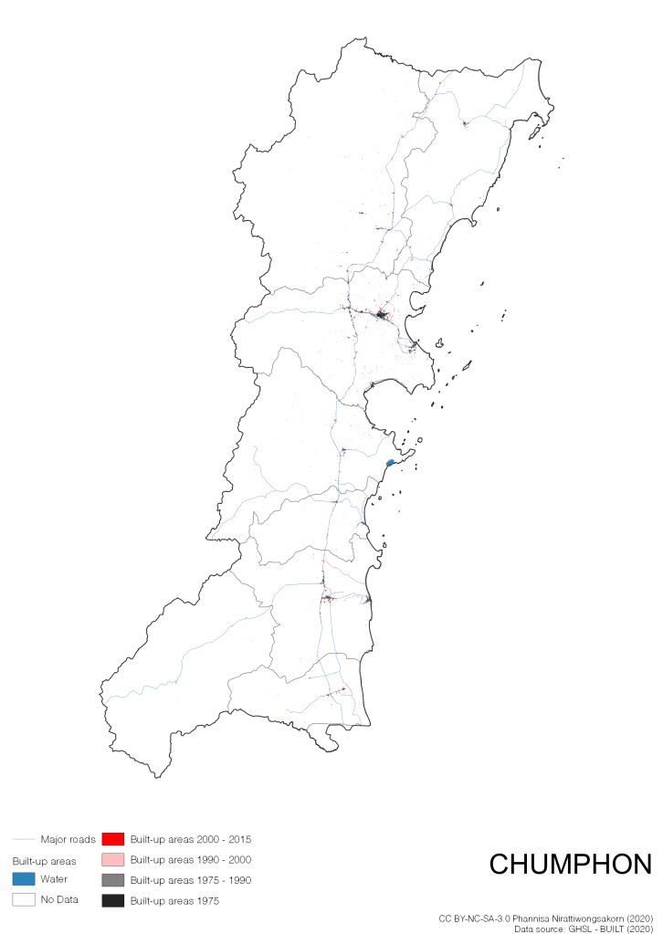 I visualize built-up areas of the 4 periods: until 1975, 1975 – 1990, 1990 – 2000, and 2000 – 2015, by province, and by district (Amphoe). Here you will see different urban patterns of the selected cities.
