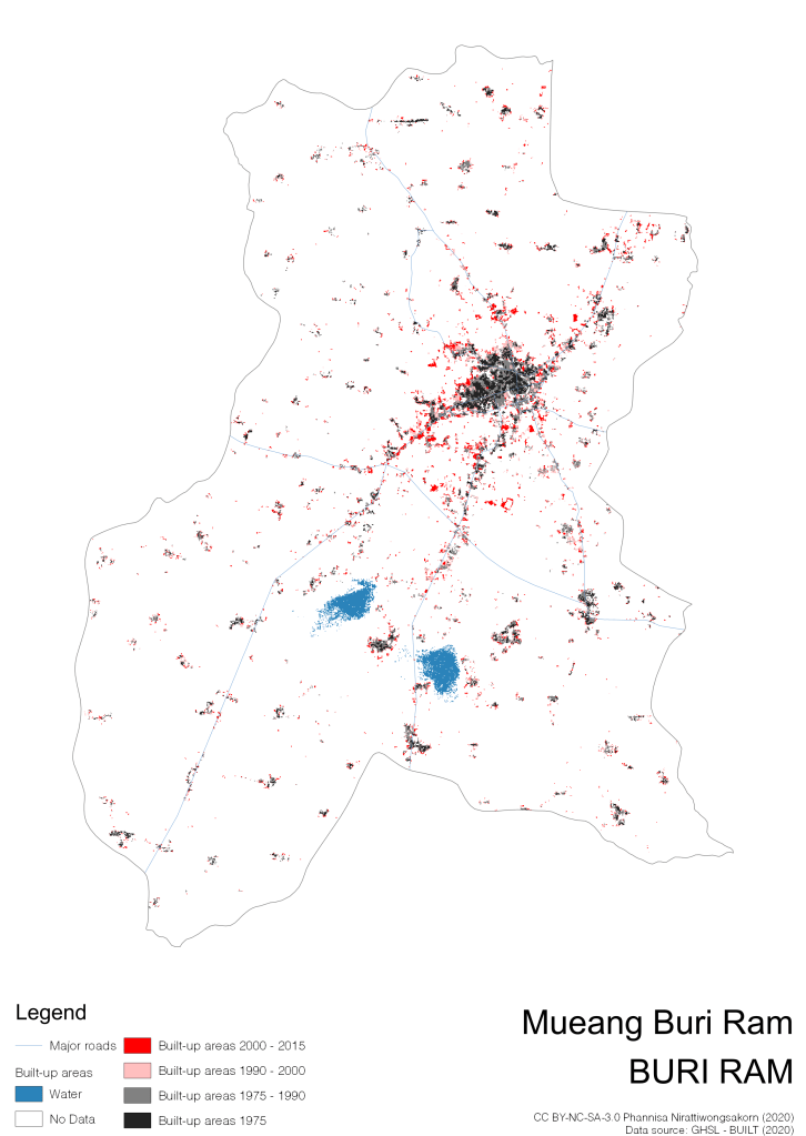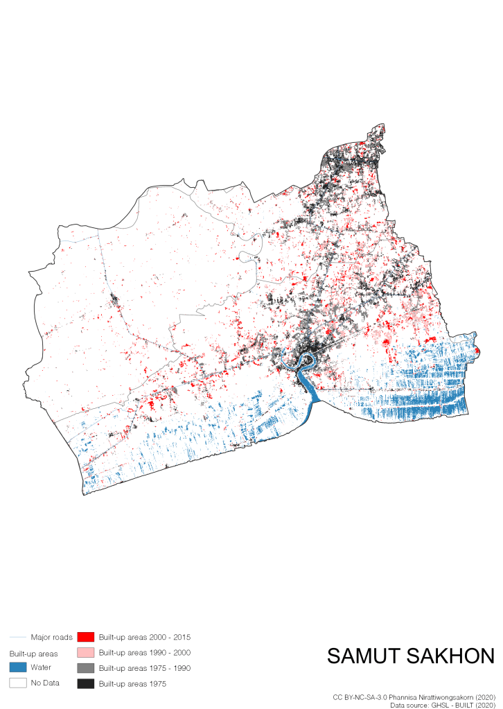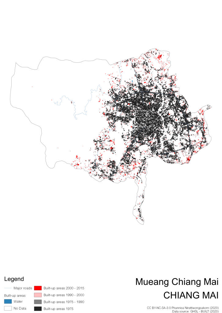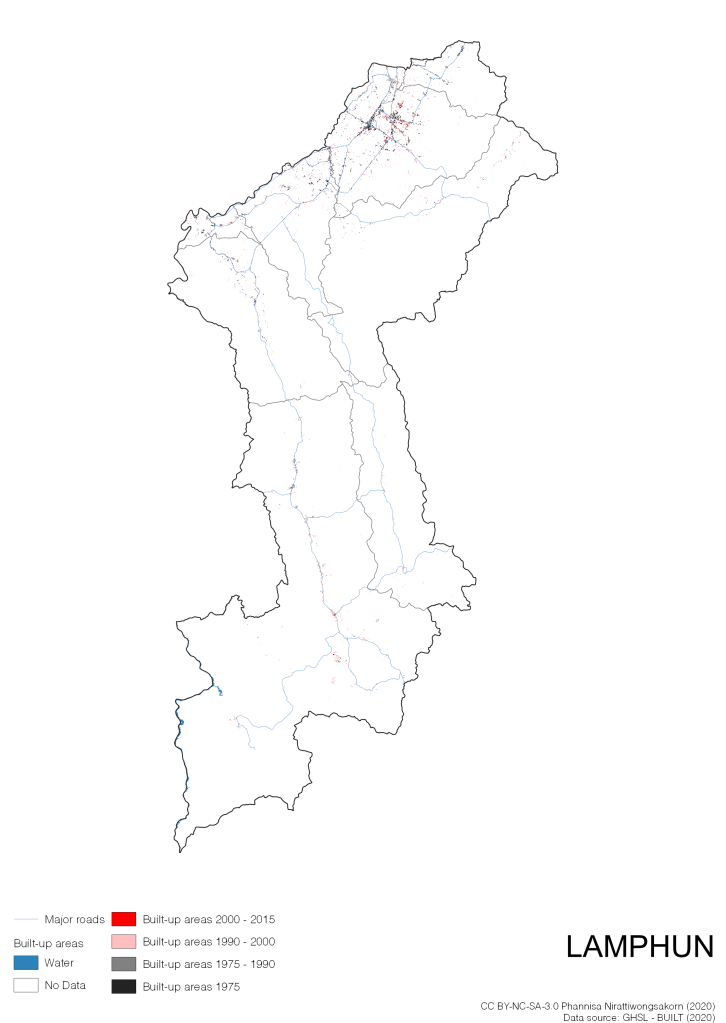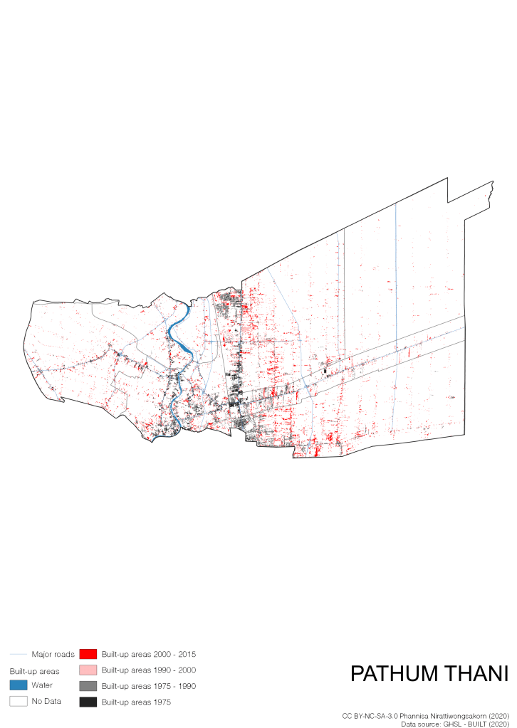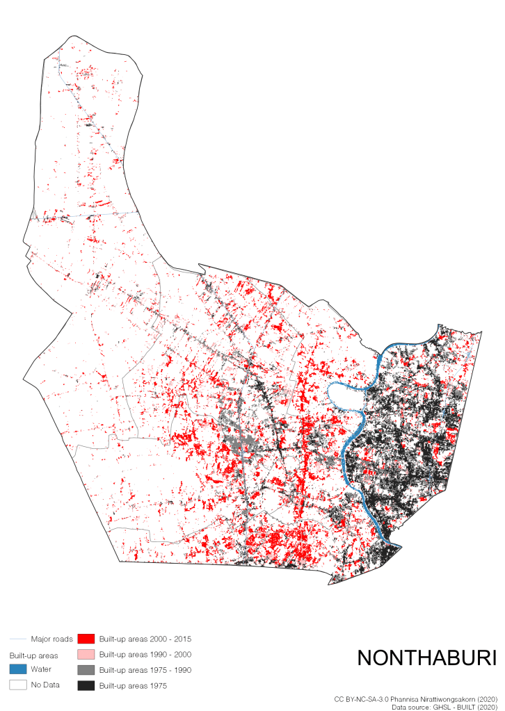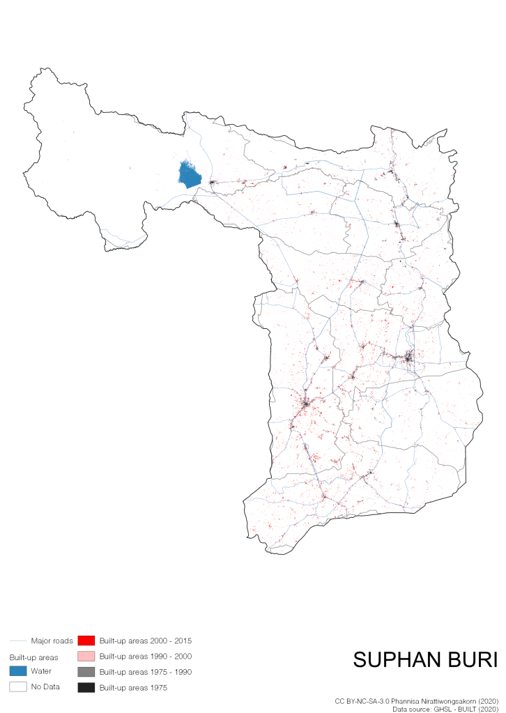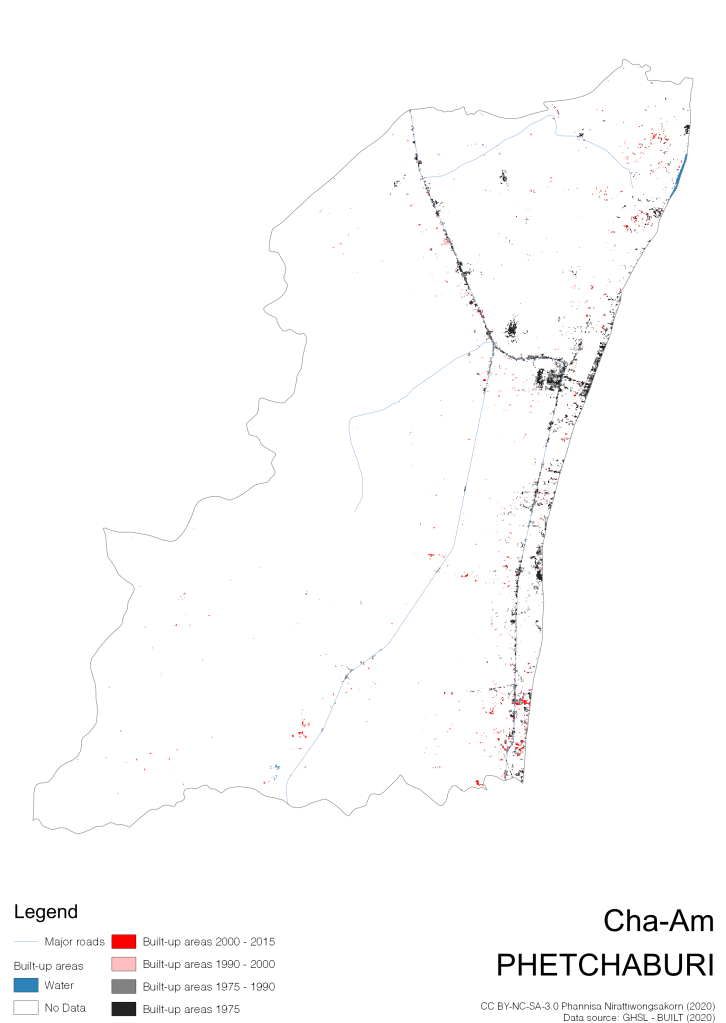 I visualize built-up areas of the 4 periods: until 1975, 1975 – 1990, 1990 – 2000, and 2000 – 2015, by province, and by district (Amphoe). Here you will see different urban patterns of the selected cities.