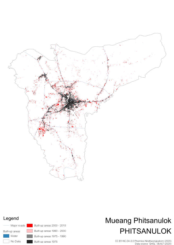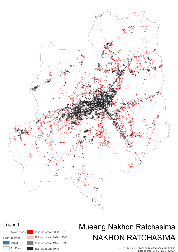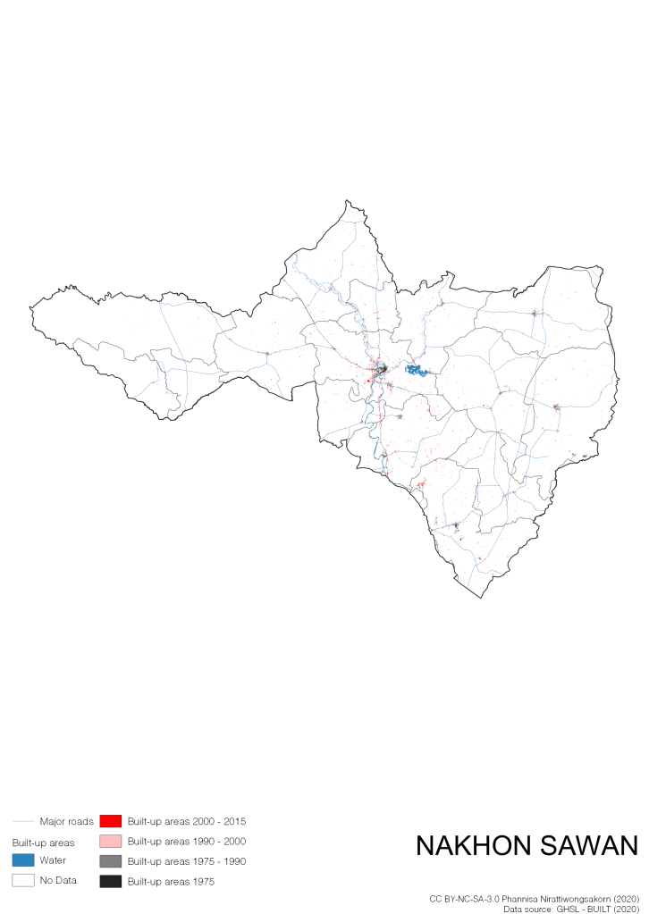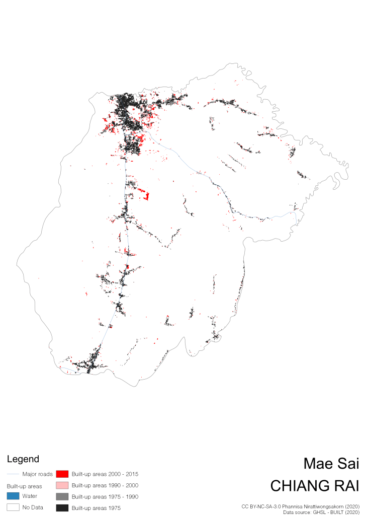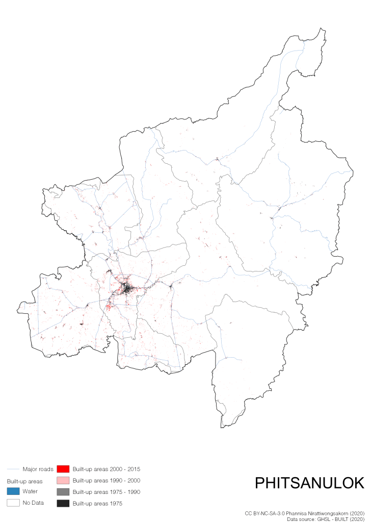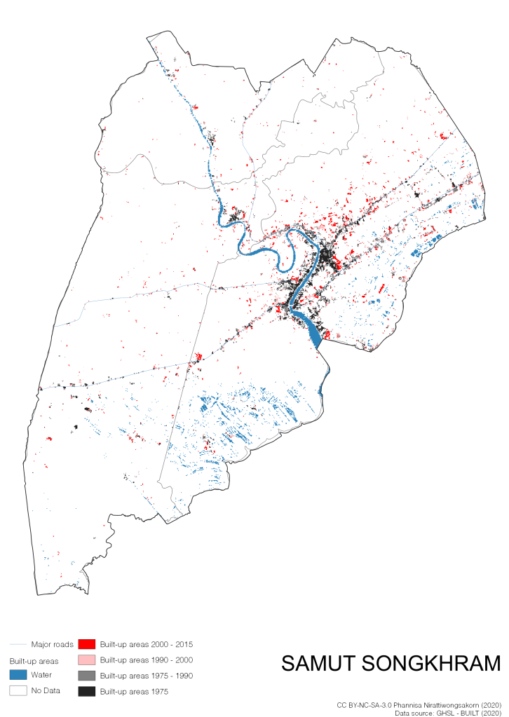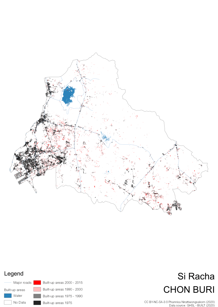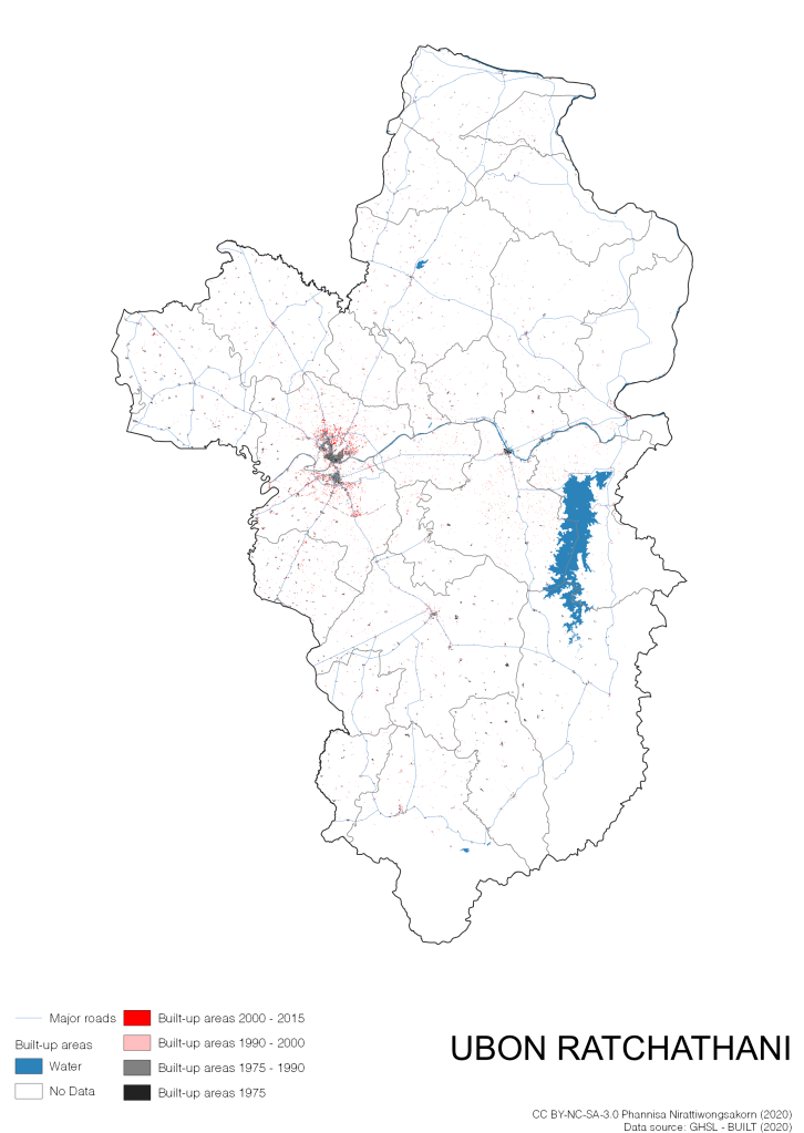 I visualize built-up areas of the 4 periods: until 1975, 1975 – 1990, 1990 – 2000, and 2000 – 2015, by province, and by district (Amphoe). Here you will see different urban patterns of the selected cities.