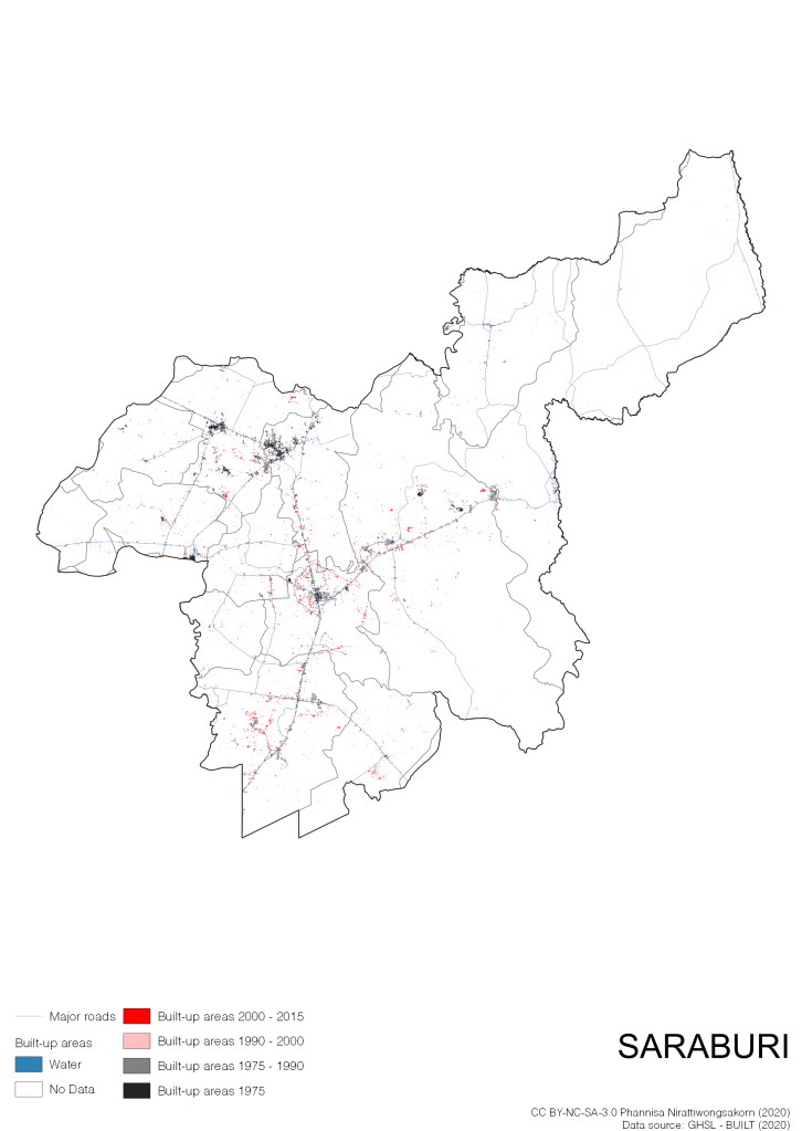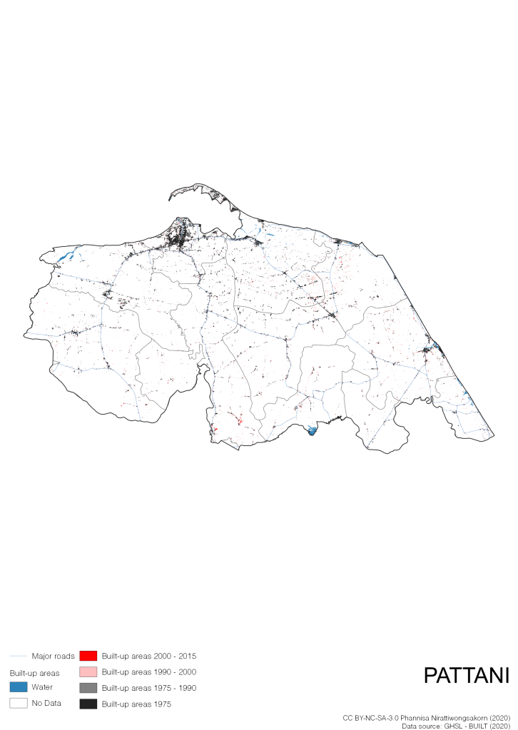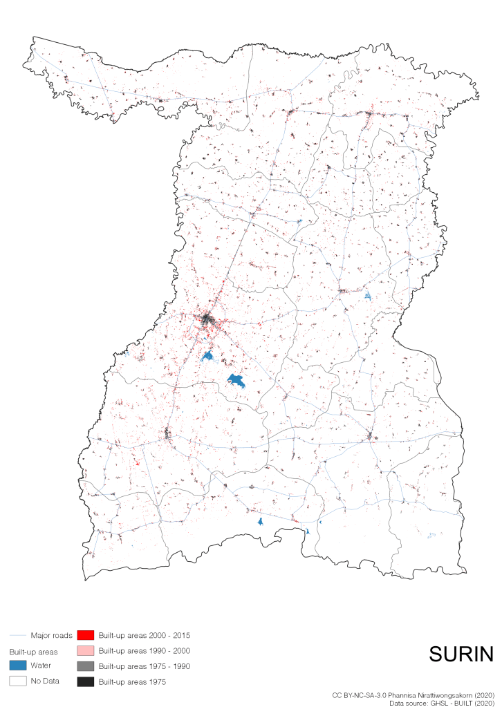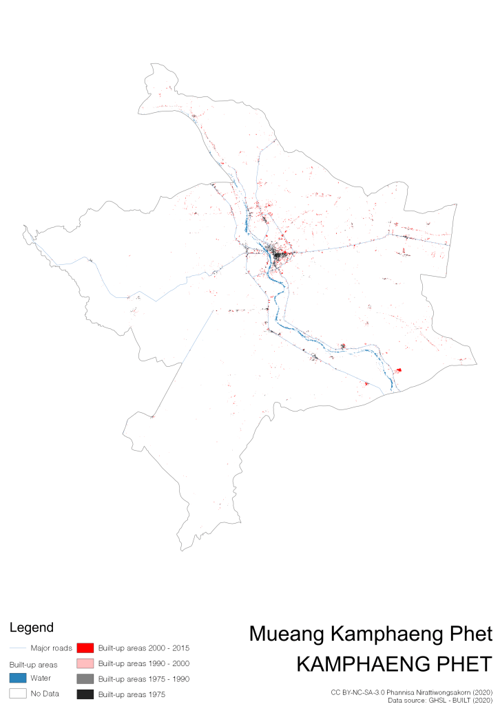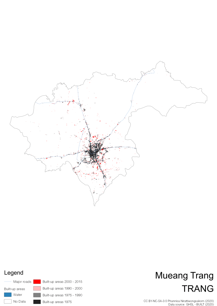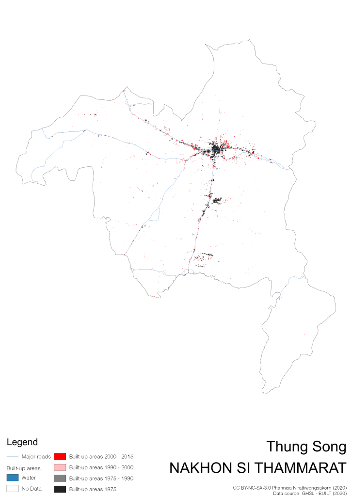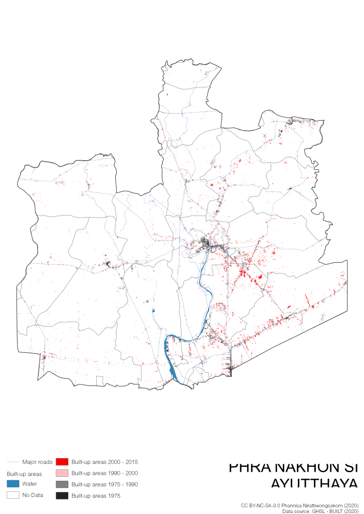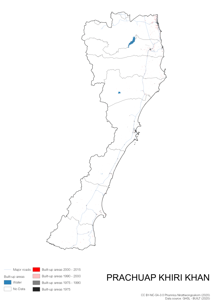 I visualize built-up areas of the 4 periods: until 1975, 1975 – 1990, 1990 – 2000, and 2000 – 2015, by province, and by district (Amphoe). Here you will see different urban patterns of the selected cities.