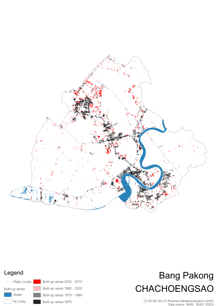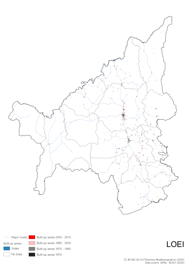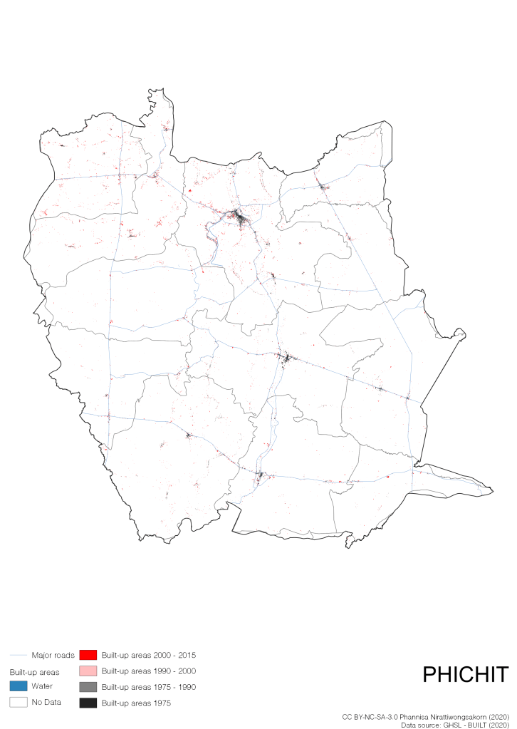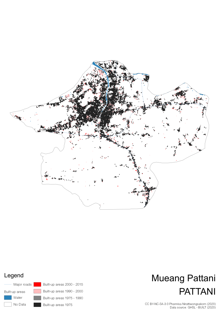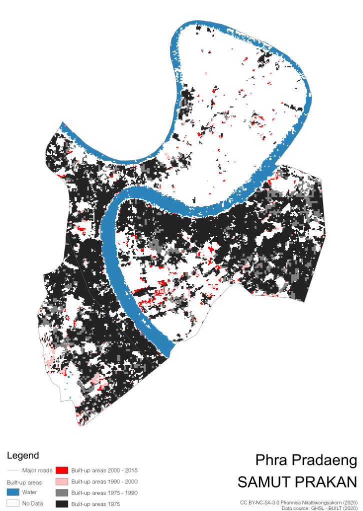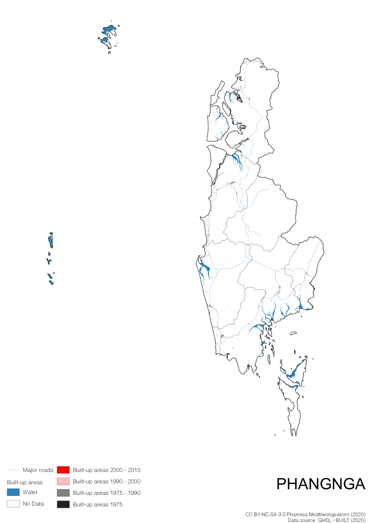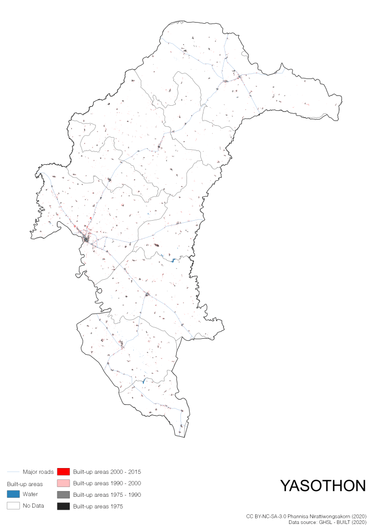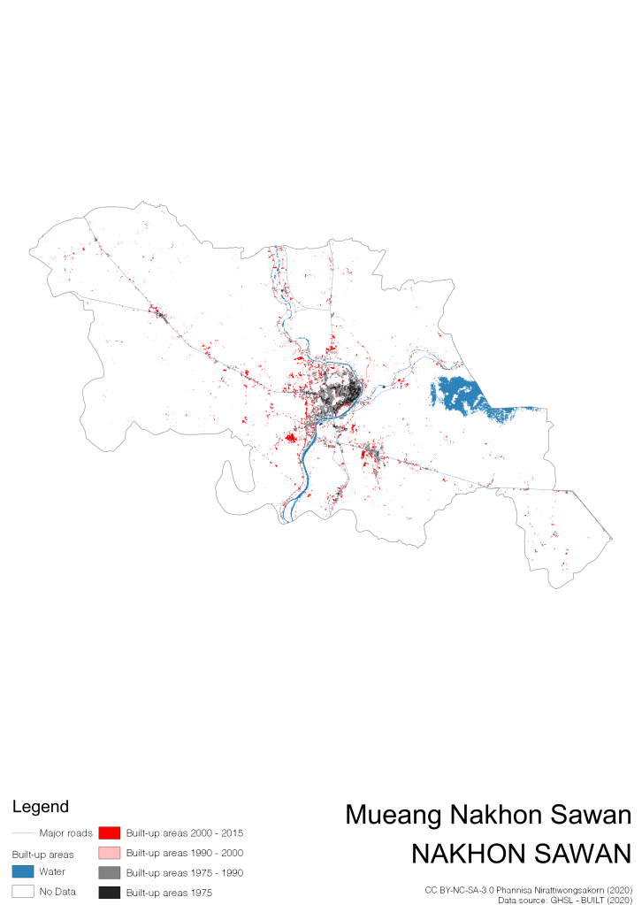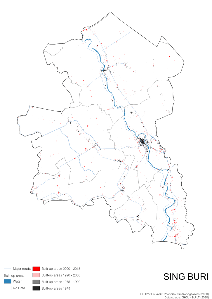 I visualize built-up areas of the 4 periods: until 1975, 1975 – 1990, 1990 – 2000, and 2000 – 2015, by province, and by district (Amphoe). Here you will see different urban patterns of the selected cities.