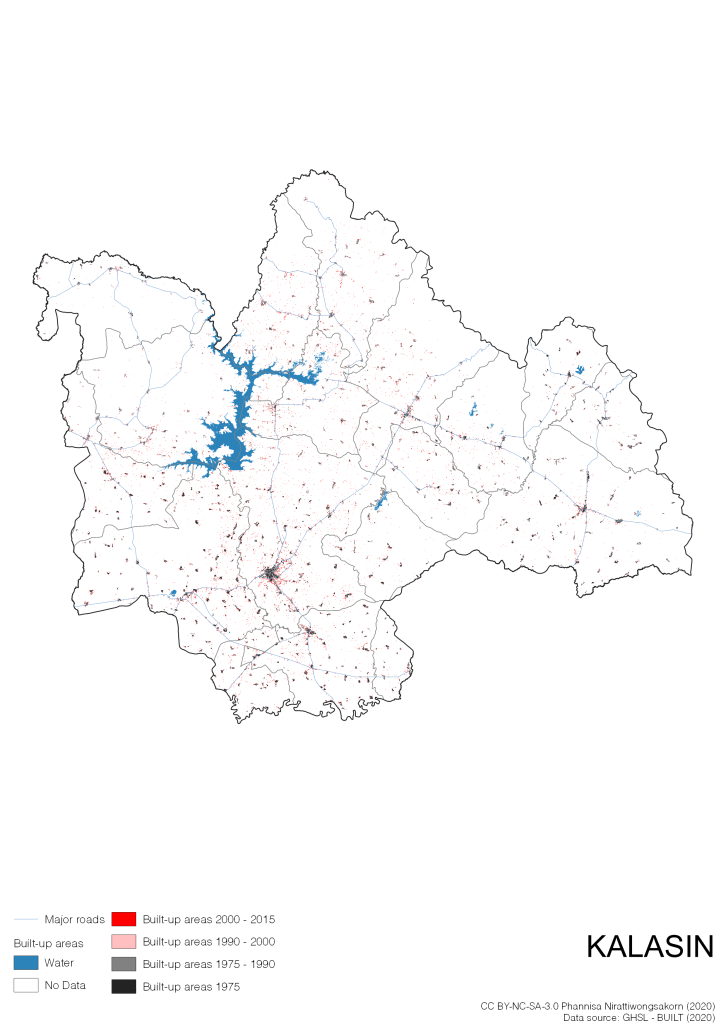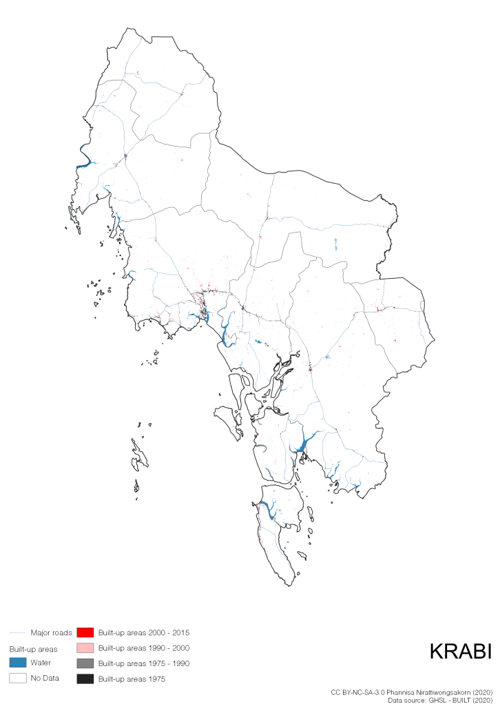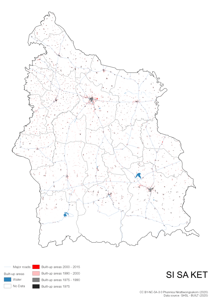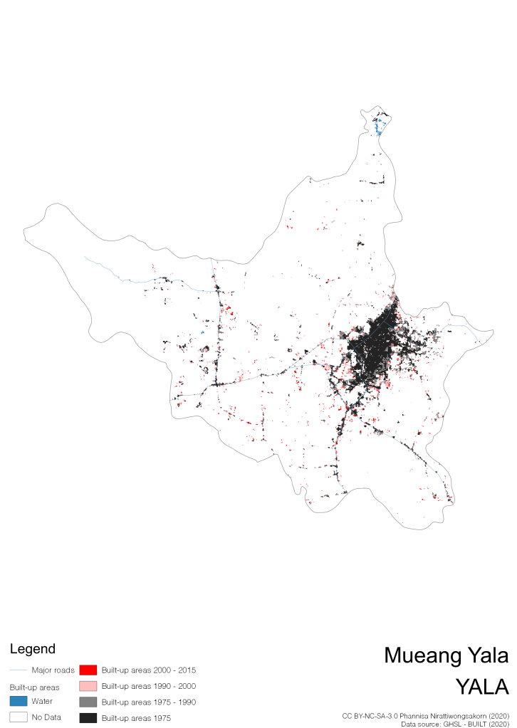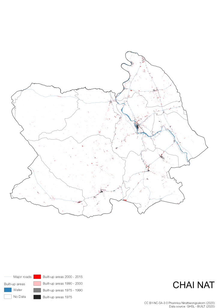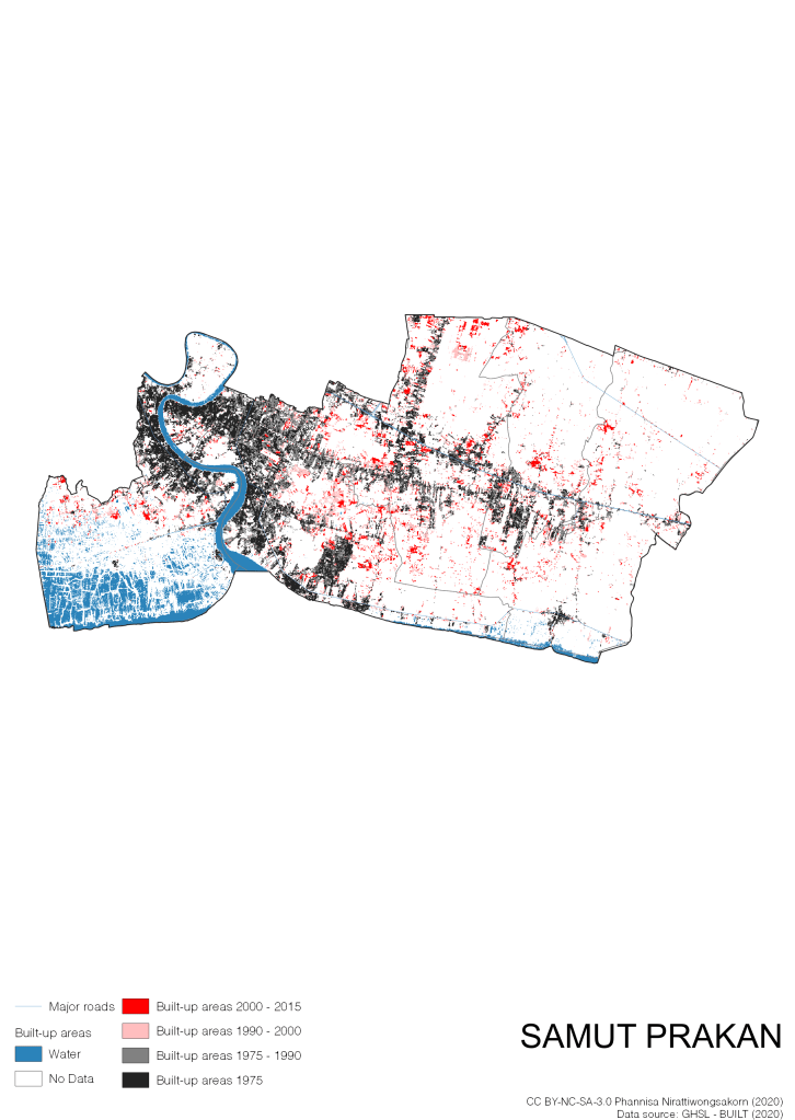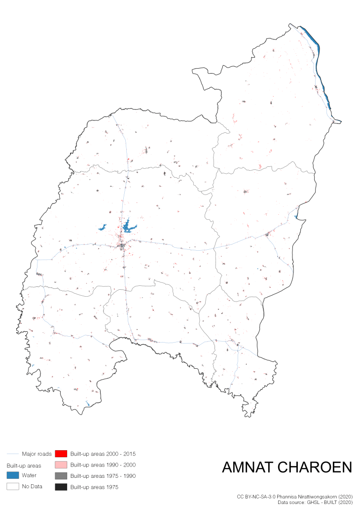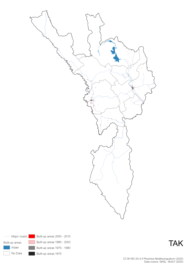 I visualize built-up areas of the 4 periods: until 1975, 1975 – 1990, 1990 – 2000, and 2000 – 2015, by province, and by district (Amphoe). Here you will see different urban patterns of the selected cities.