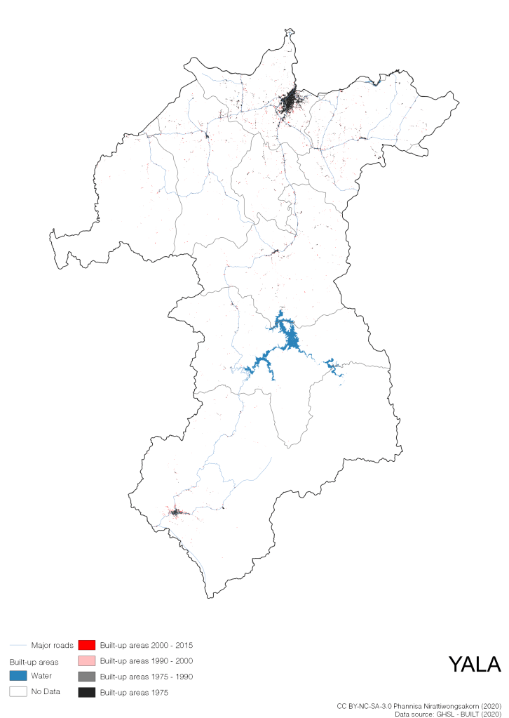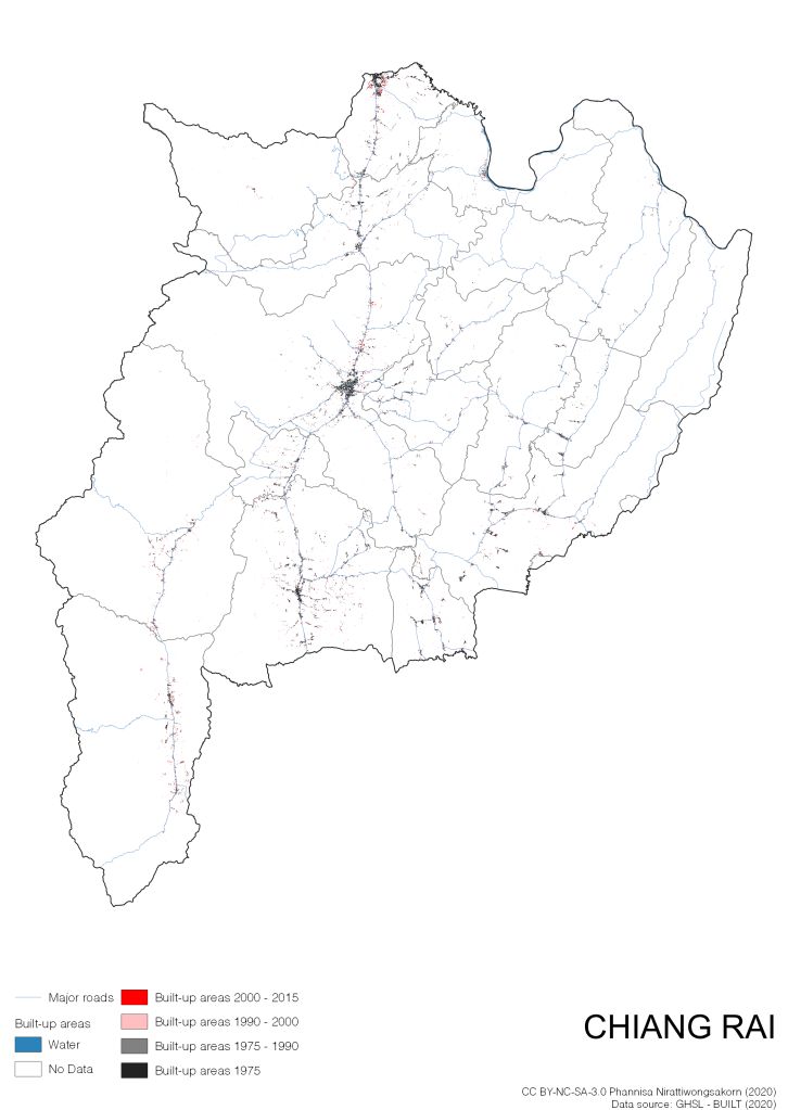 My procrastination project visualizing Thailand’s Built-up areas: human settlements characterized by constructed, man-made objects that include buildings, associated structures, civil works (GHSL, 2019). In a nutshell, built-up areas are physical aspect of a city. Visualizing built-up areas help us understand human settlements, urban patterns, economic and infrastructure development, and even possible underlying problems such as urban sprawl. Apart from urban planning rationale, I want to create artistic yet informative maps that everyone can enjoy while having some useful information.
