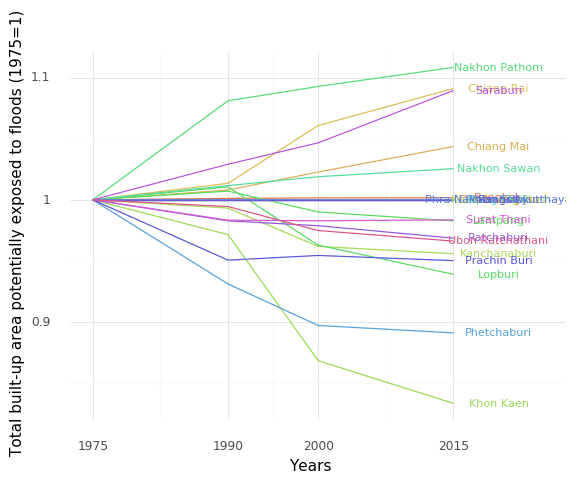 Using the calculated flood exposure of 41 urban centers (defined by specific cut-off values on resident population and built-up surface share in a 1×1 km uniform global grid) of GHSL – Urban Centre Database 2019 (UCDB R2019A) dataset, we compare the changes of percent of built-up areas under flood exposure to total built-up areas in each year (1975, 1990, 2000, and 2015). Potentially built-up areas are expected to grow no more than flood exposure areas (the output number <= 1). As you can see Chonburi has increased its exposure to flood twice than that of 1975.