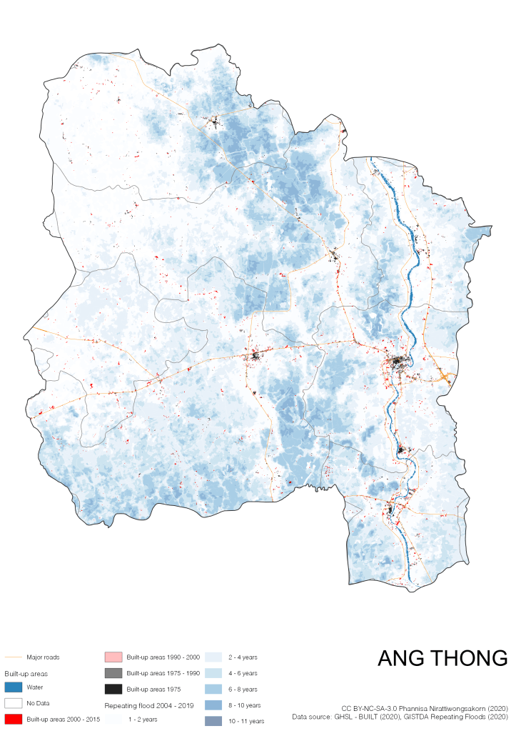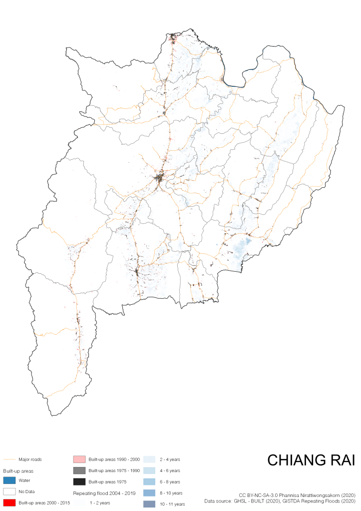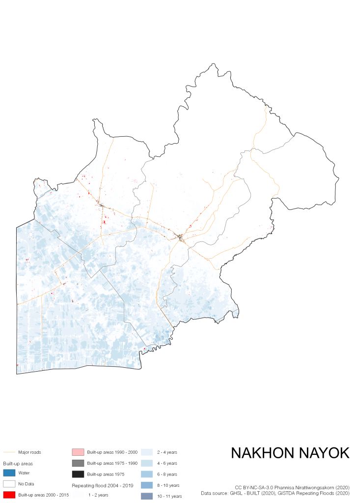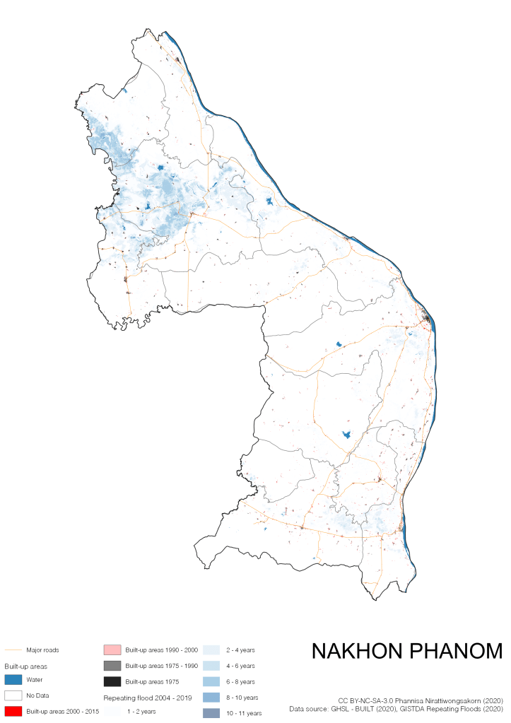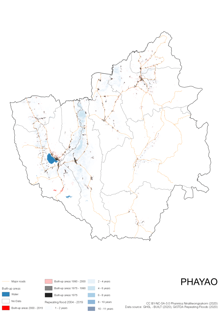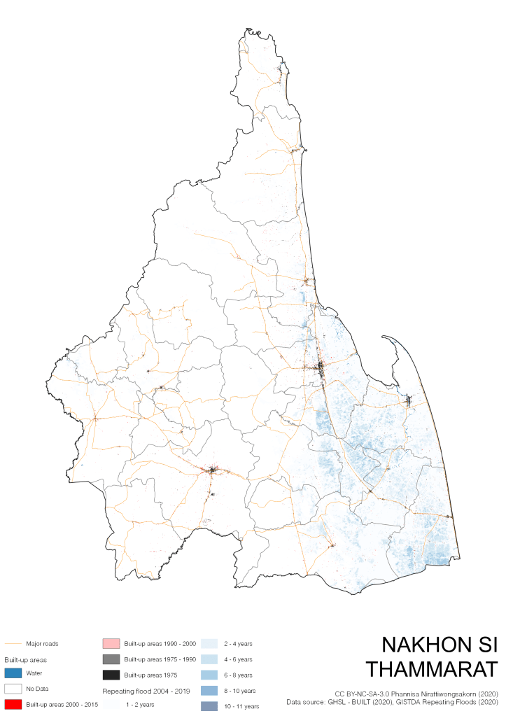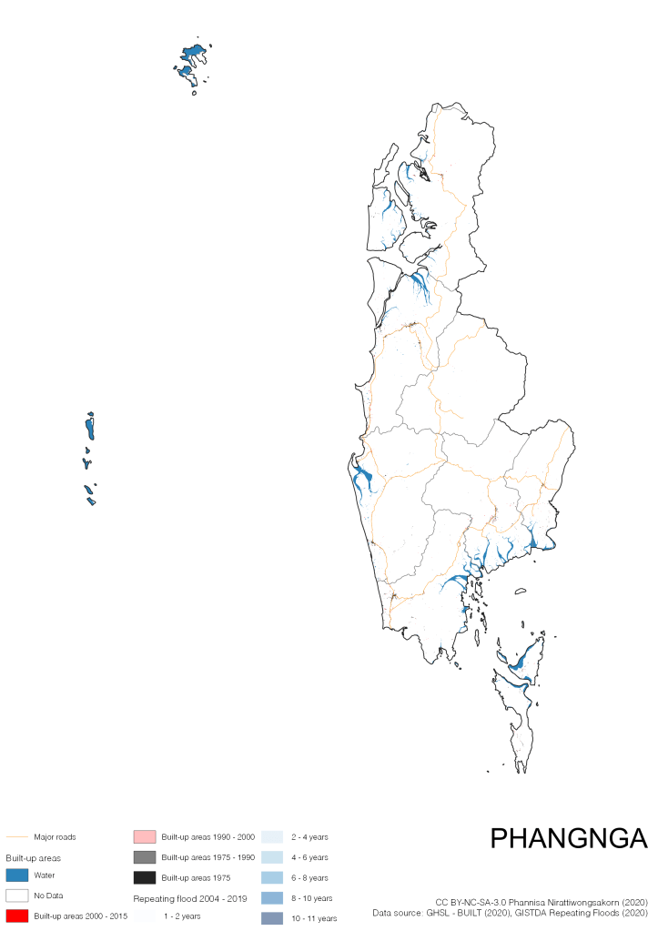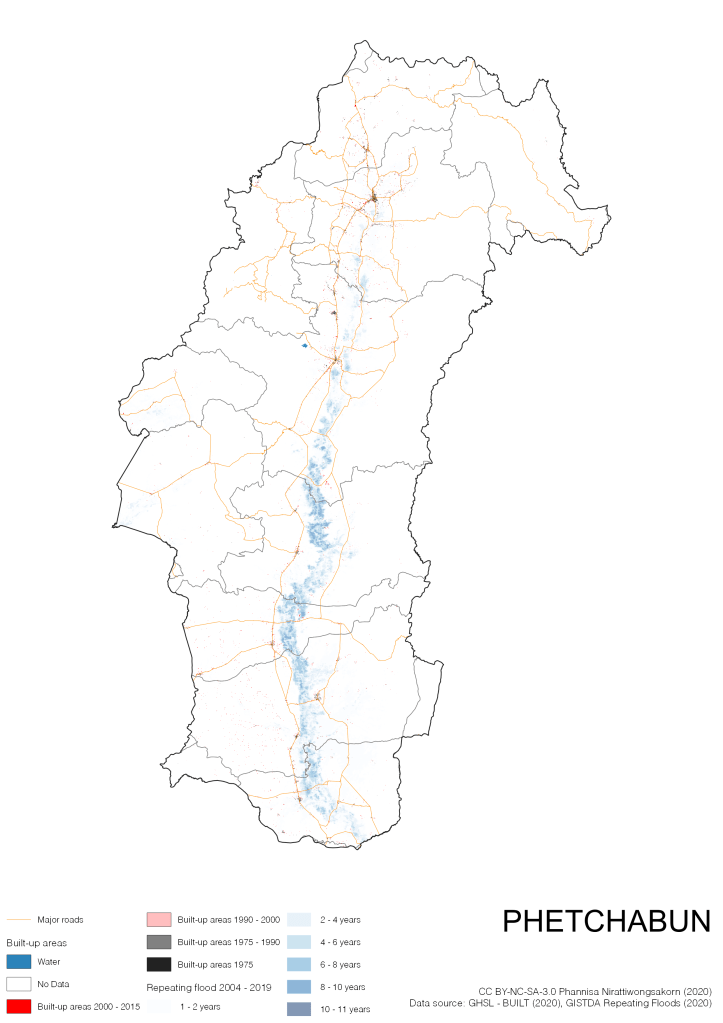 On the continuation of Thailand’s Built-up Areas 1975 – 2015 Visualization which show built-up areas of the 4 periods: until 1975, 1975 – 1990, 1990 – 2000, and 2000 – 2015, by province and by district (Amphoe); I add annual repeating flood layer of 2004 – 2019 (GISTDA, 2020) to the current visualization. According to UNDP (2020), Thailand is susceptible to extreme weather events such as tropical storms, floods and drought because of climate change. With the fact that Thai settlements are usually close to rivers and shorelines, the highest repeating flooding, calculated from GISTDA dataset, is 11 out of 15 years. Here you will see many cities with high flood risks.