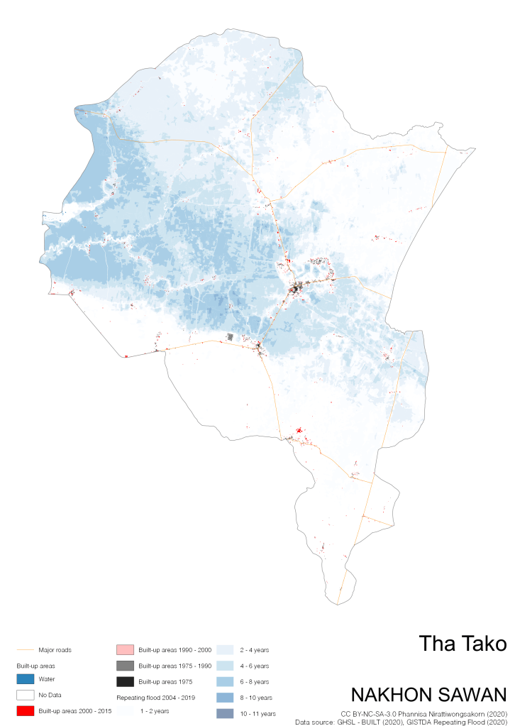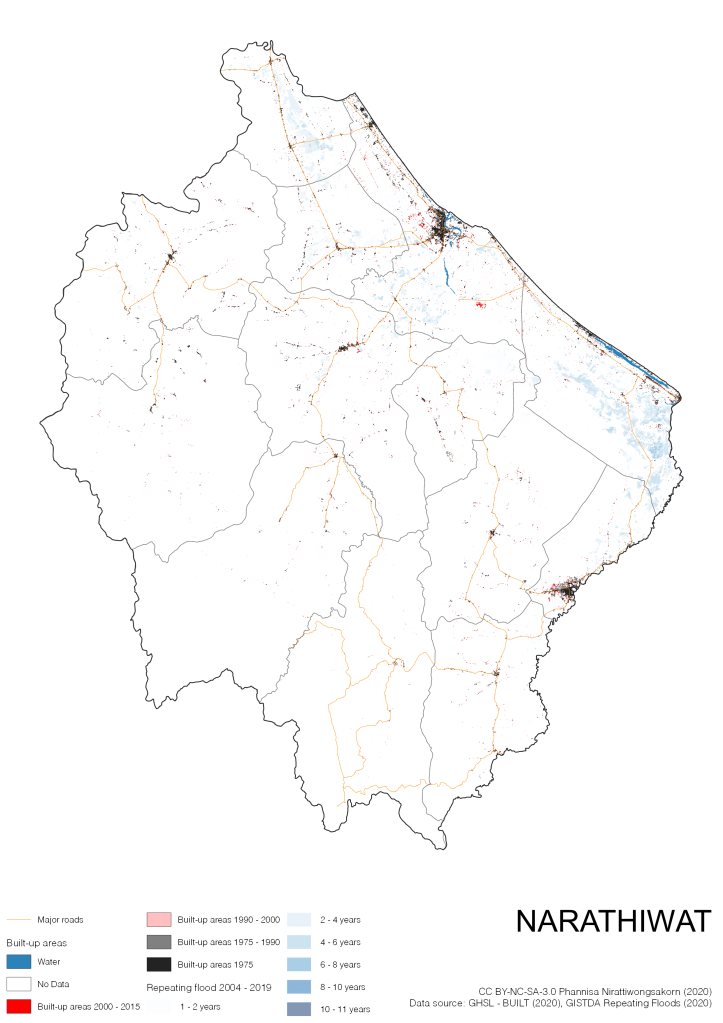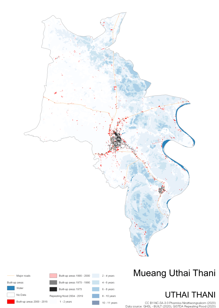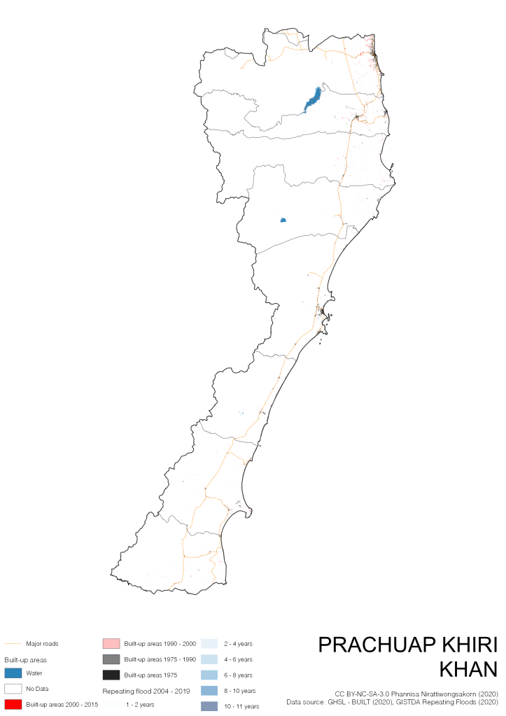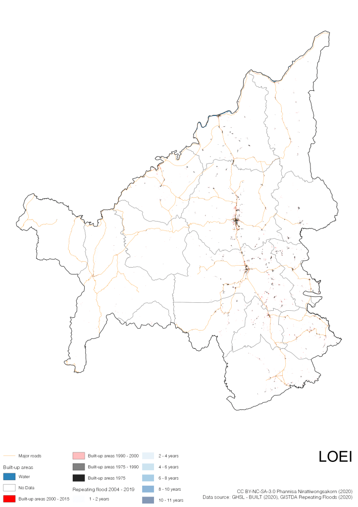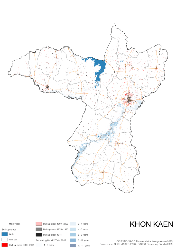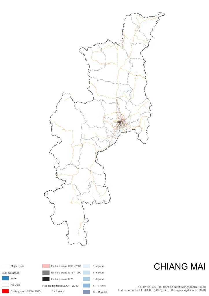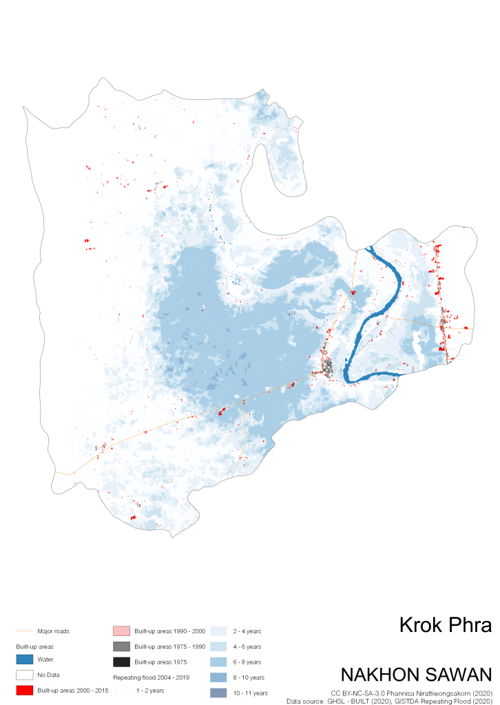 On the continuation of Thailand’s Built-up Areas 1975 – 2015 Visualization which show built-up areas of the 4 periods: until 1975, 1975 – 1990, 1990 – 2000, and 2000 – 2015, by province and by district (Amphoe); I add annual repeating flood layer of 2004 – 2019 (GISTDA, 2020) to the current visualization. According to UNDP (2020), Thailand is susceptible to extreme weather events such as tropical storms, floods and drought because of climate change. With the fact that Thai settlements are usually close to rivers and shorelines, the highest repeating flooding, calculated from GISTDA dataset, is 11 out of 15 years. Here you will see many cities with high flood risks.