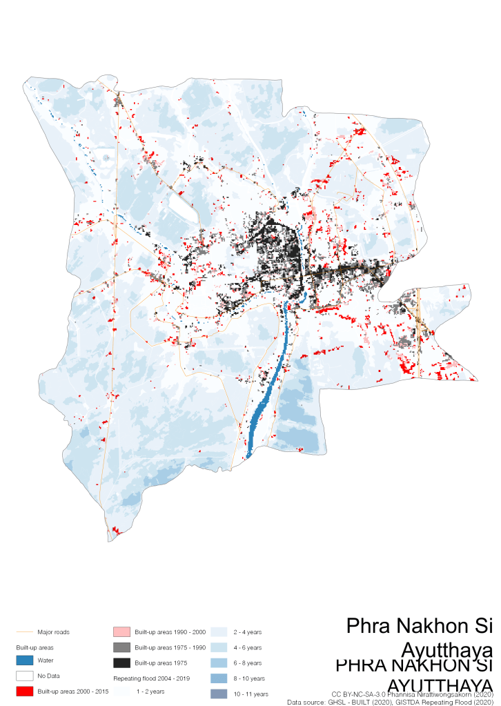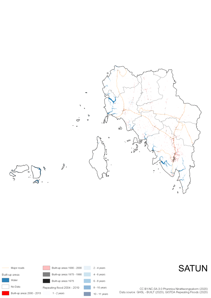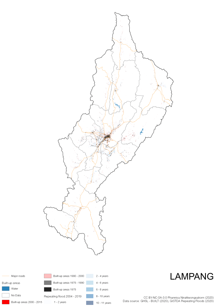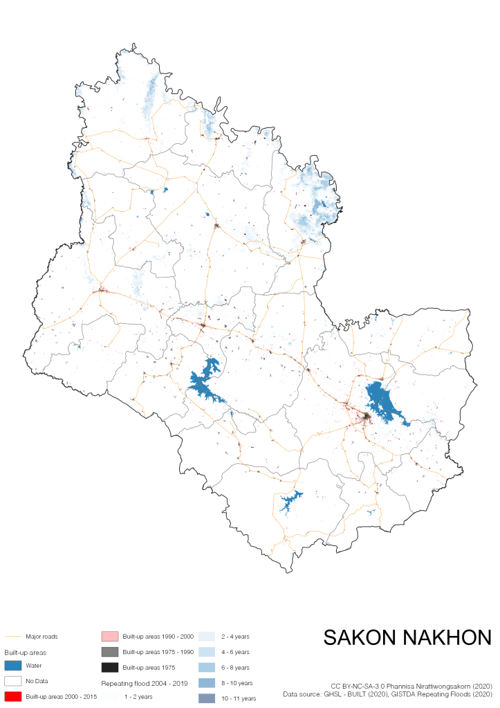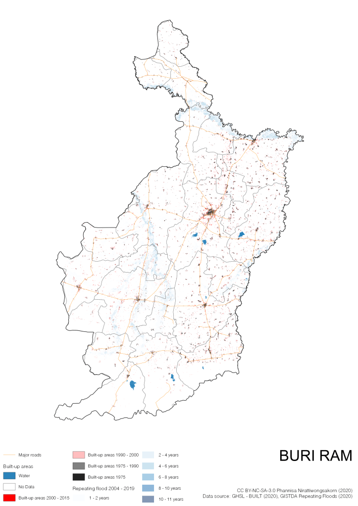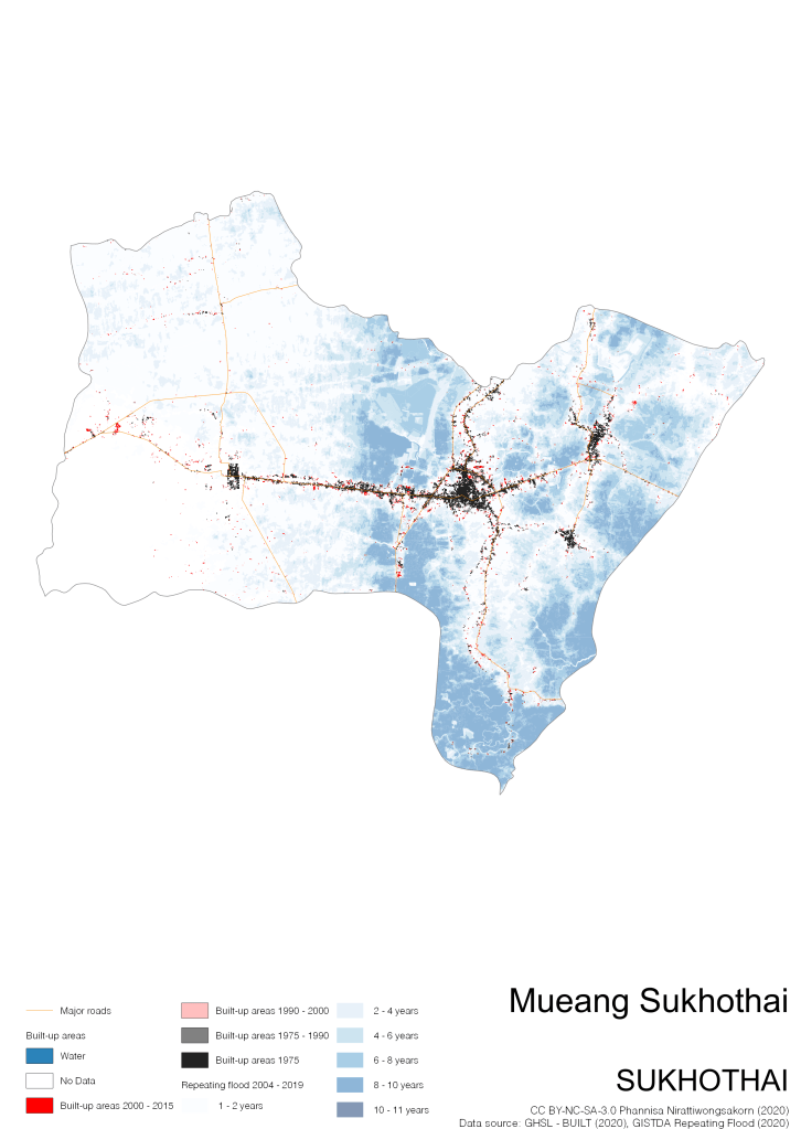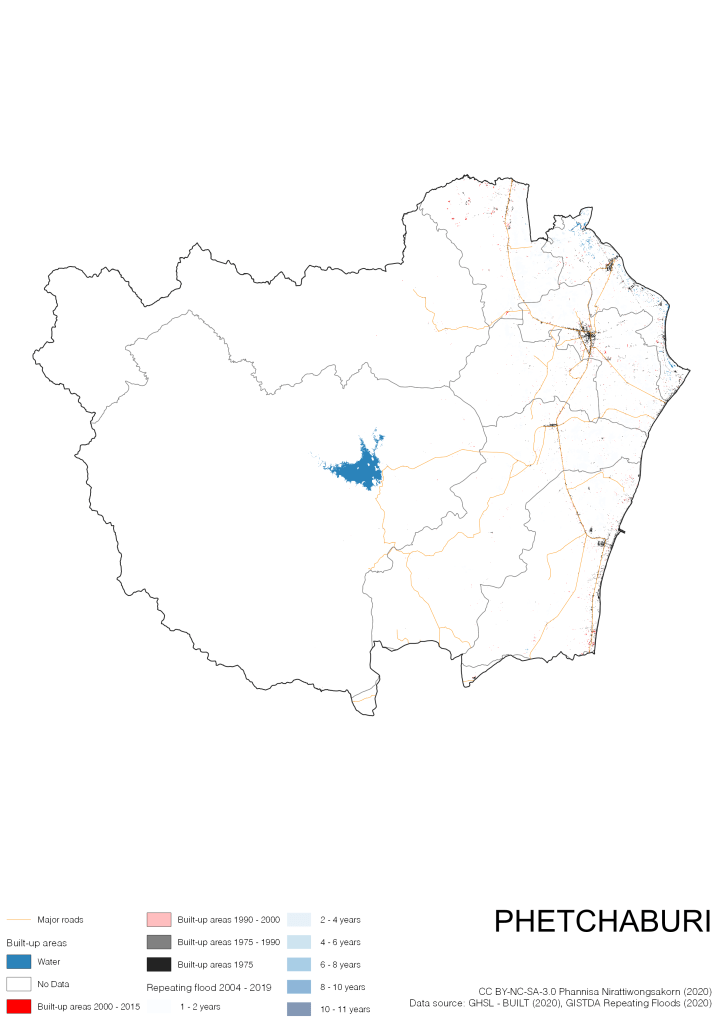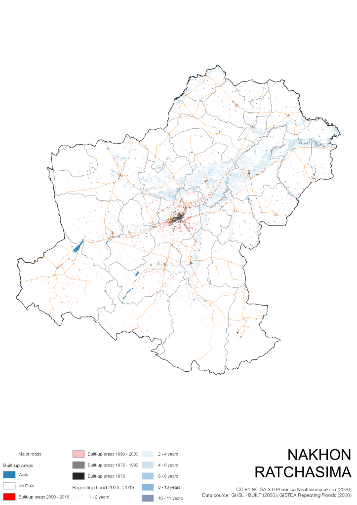 On the continuation of Thailand’s Built-up Areas 1975 – 2015 Visualization which show built-up areas of the 4 periods: until 1975, 1975 – 1990, 1990 – 2000, and 2000 – 2015, by province and by district (Amphoe); I add annual repeating flood layer of 2004 – 2019 (GISTDA, 2020) to the current visualization. According to UNDP (2020), Thailand is susceptible to extreme weather events such as tropical storms, floods and drought because of climate change. With the fact that Thai settlements are usually close to rivers and shorelines, the highest repeating flooding, calculated from GISTDA dataset, is 11 out of 15 years. Here you will see many cities with high flood risks.