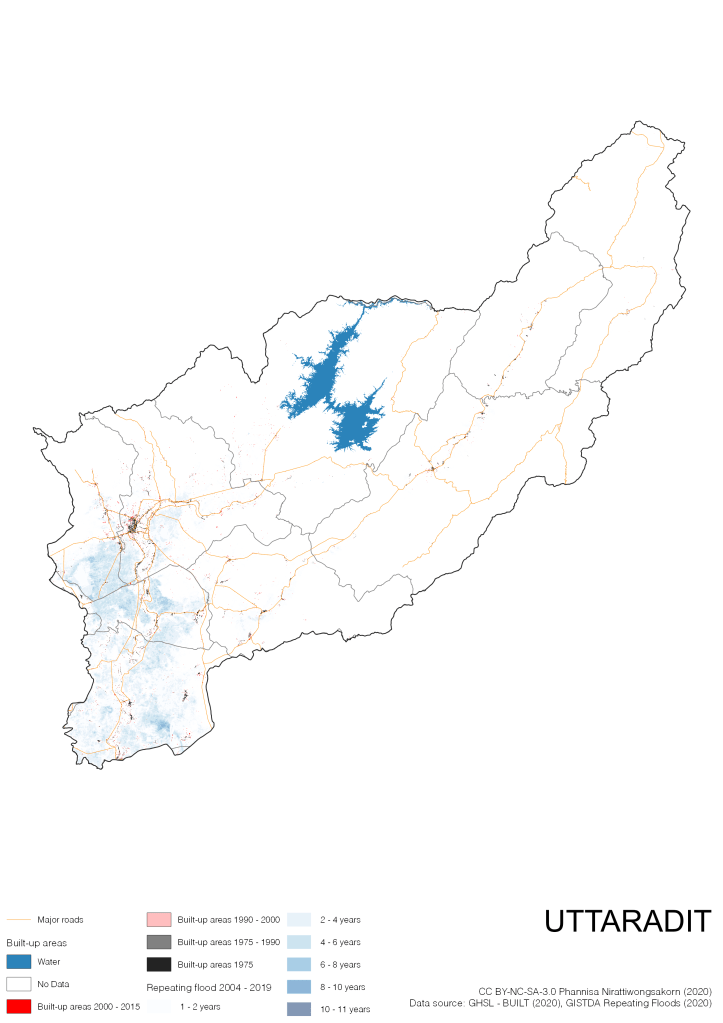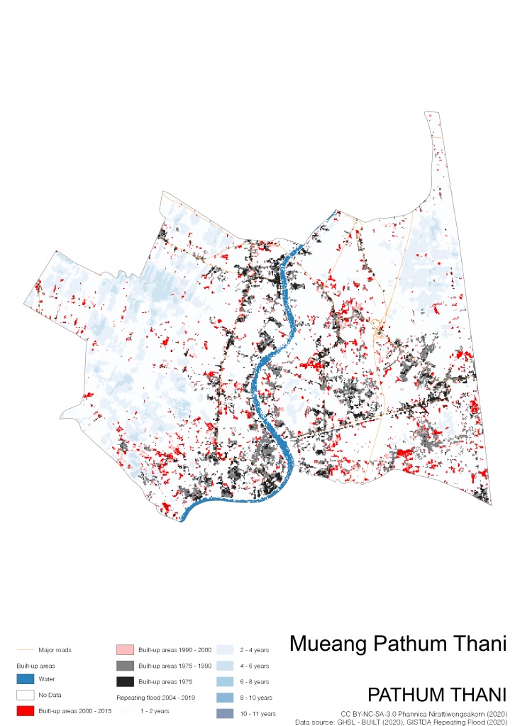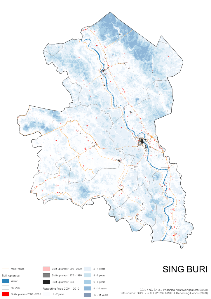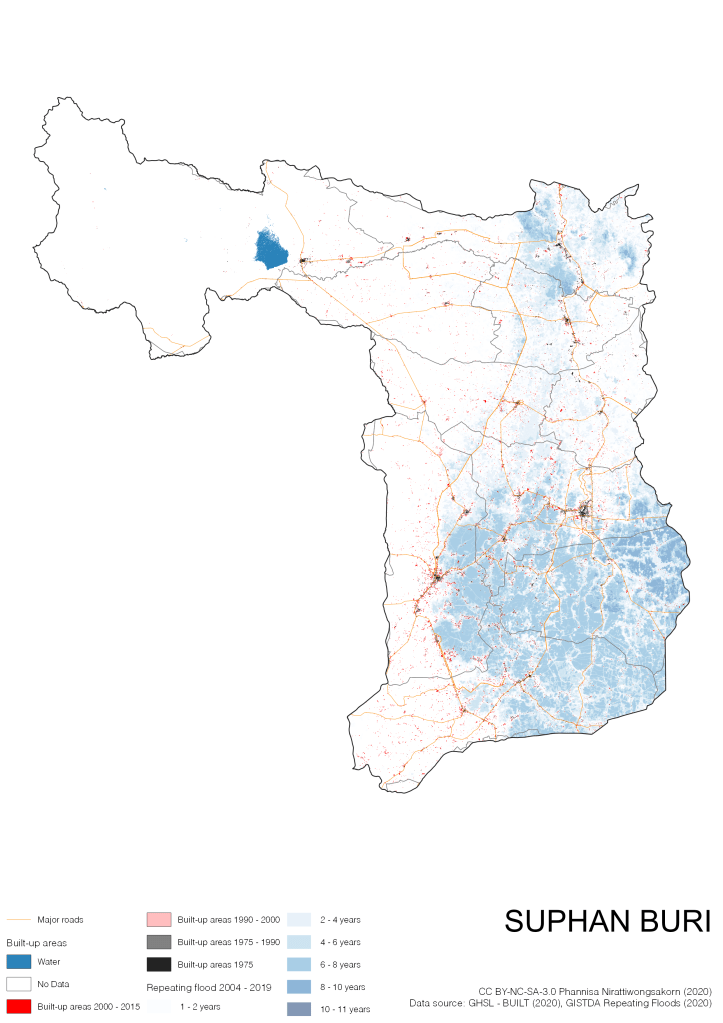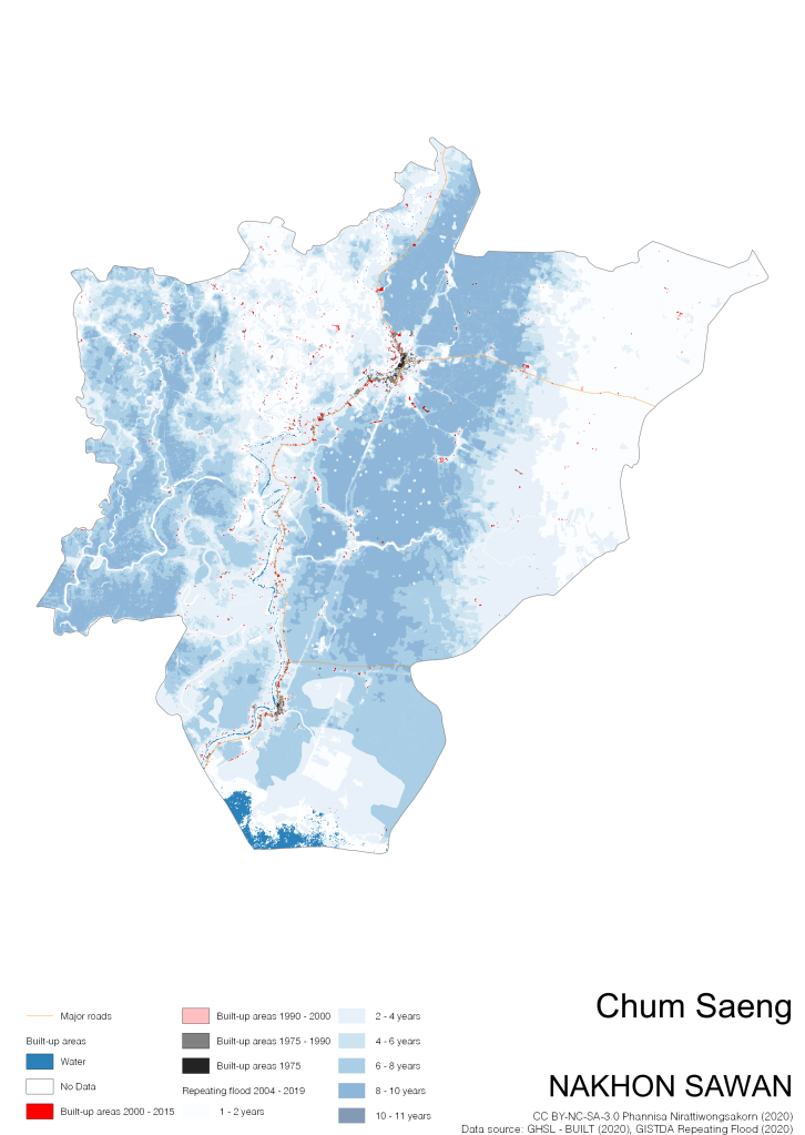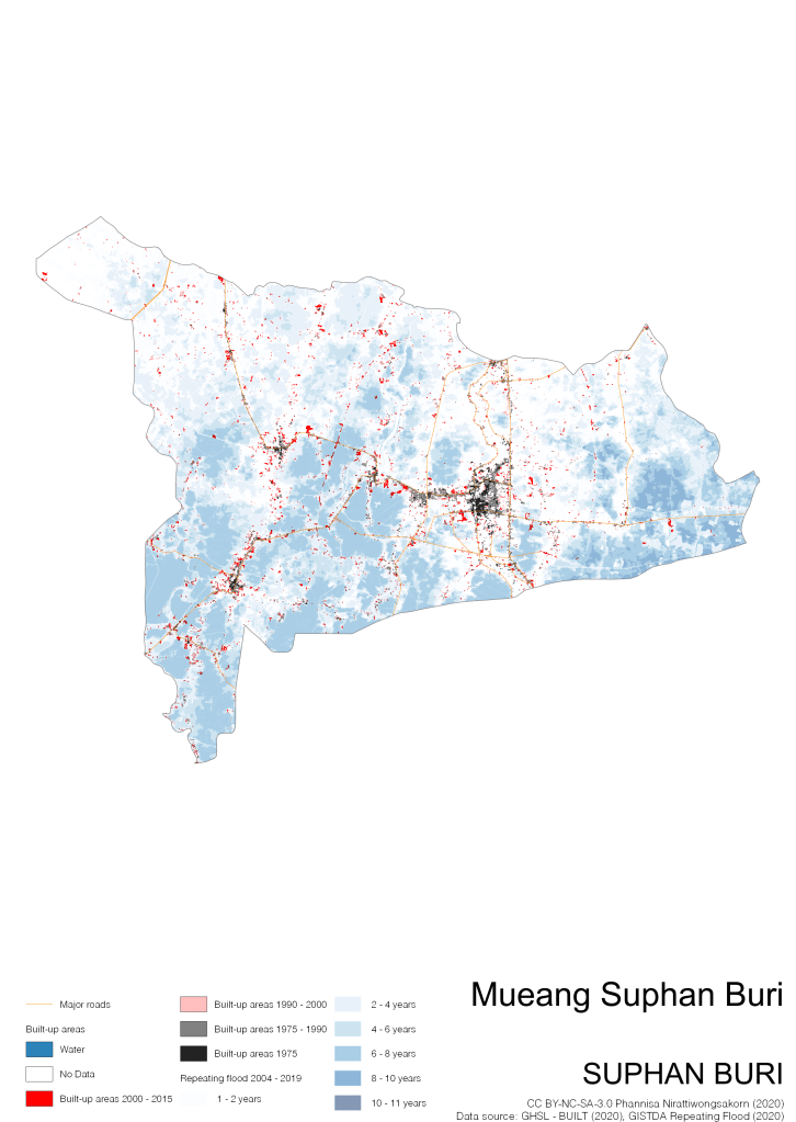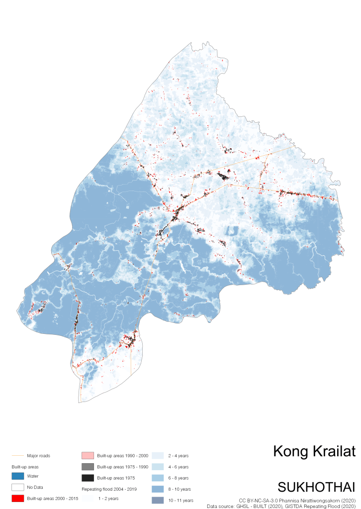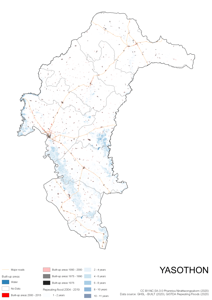 On the continuation of Thailand’s Built-up Areas 1975 – 2015 Visualization which show built-up areas of the 4 periods: until 1975, 1975 – 1990, 1990 – 2000, and 2000 – 2015, by province and by district (Amphoe); I add annual repeating flood layer of 2004 – 2019 (GISTDA, 2020) to the current visualization. According to UNDP (2020), Thailand is susceptible to extreme weather events such as tropical storms, floods and drought because of climate change. With the fact that Thai settlements are usually close to rivers and shorelines, the highest repeating flooding, calculated from GISTDA dataset, is 11 out of 15 years. Here you will see many cities with high flood risks.