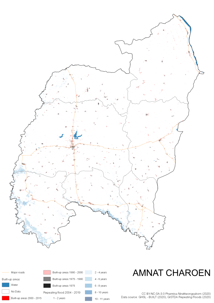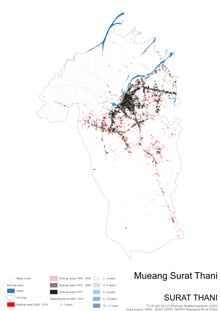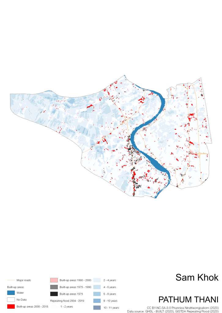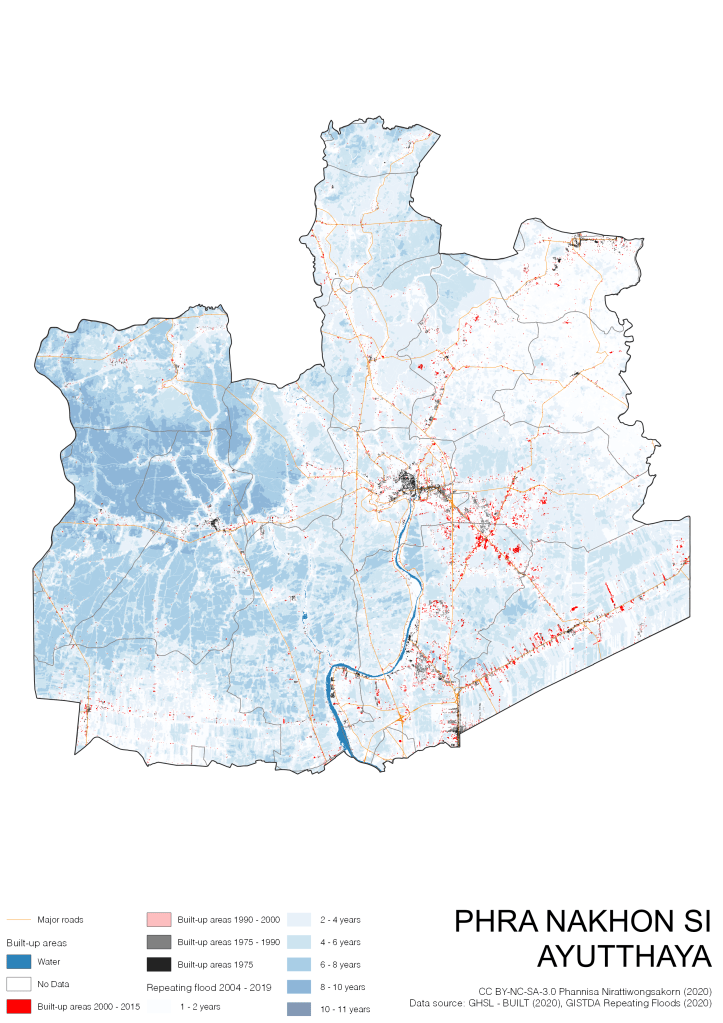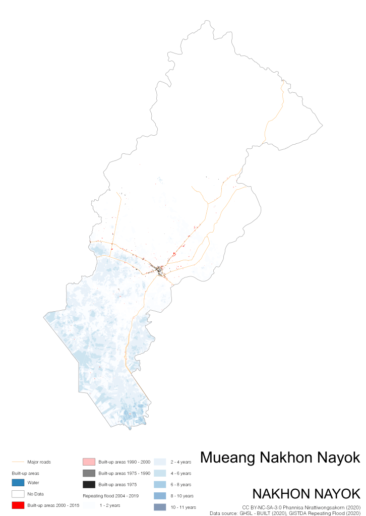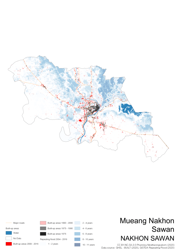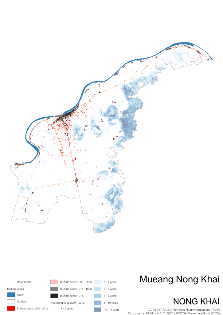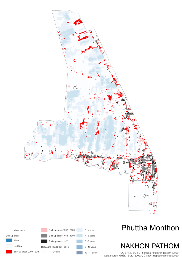 On the continuation of Thailand’s Built-up Areas 1975 – 2015 Visualization which show built-up areas of the 4 periods: until 1975, 1975 – 1990, 1990 – 2000, and 2000 – 2015, by province and by district (Amphoe); I add annual repeating flood layer of 2004 – 2019 (GISTDA, 2020) to the current visualization. According to UNDP (2020), Thailand is susceptible to extreme weather events such as tropical storms, floods and drought because of climate change. With the fact that Thai settlements are usually close to rivers and shorelines, the highest repeating flooding, calculated from GISTDA dataset, is 11 out of 15 years. Here you will see many cities with high flood risks.