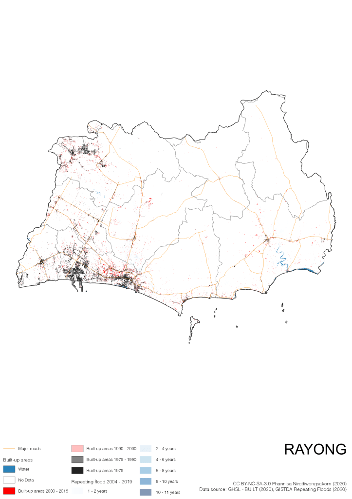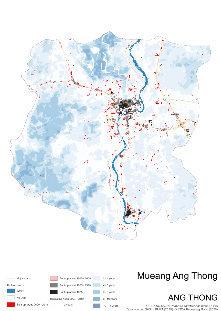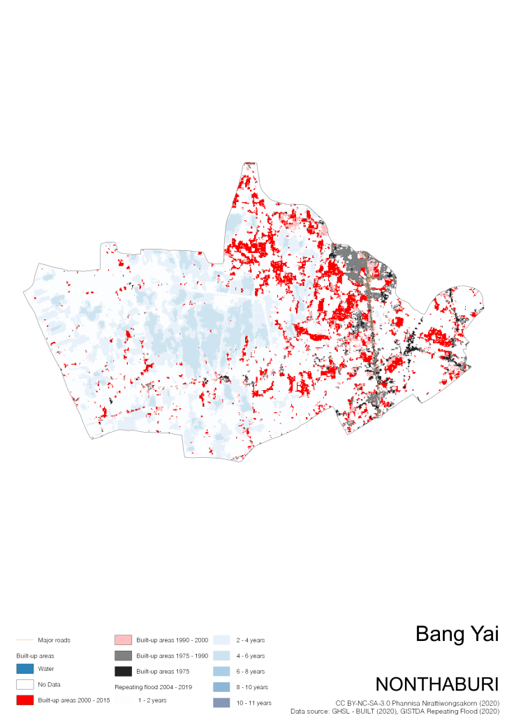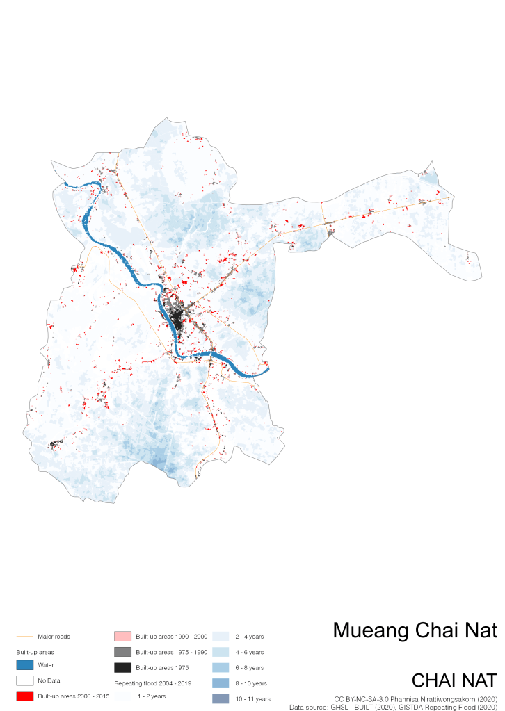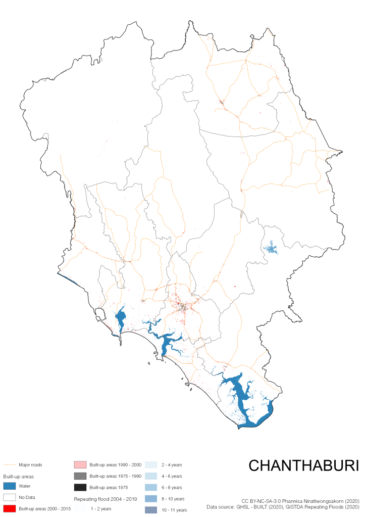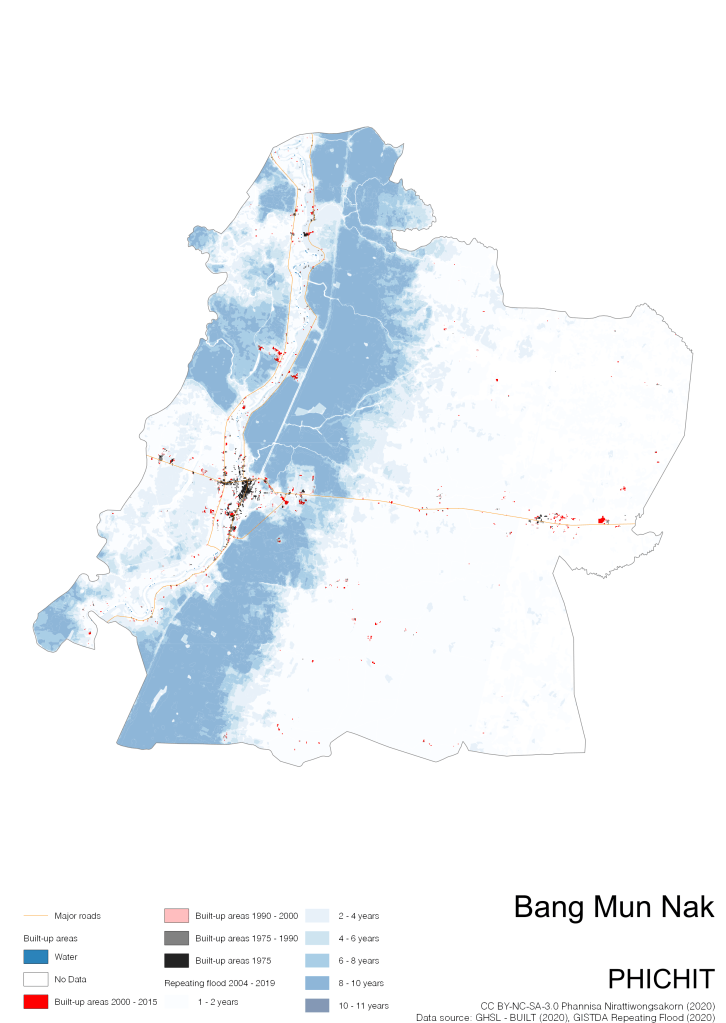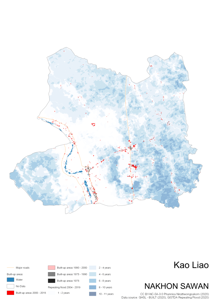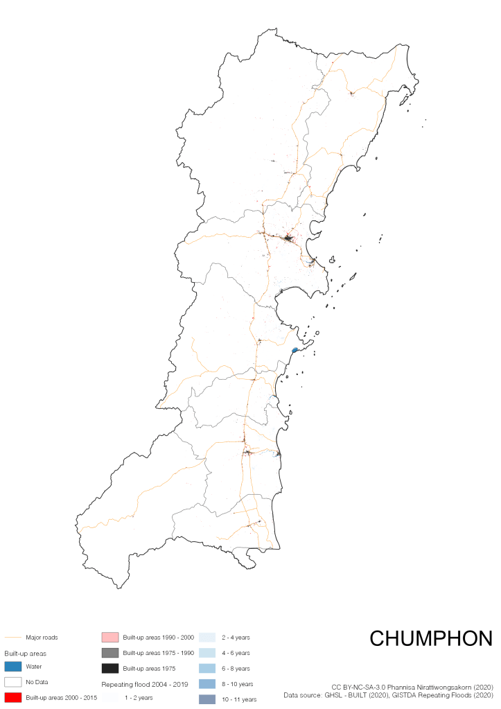 On the continuation of Thailand’s Built-up Areas 1975 – 2015 Visualization which show built-up areas of the 4 periods: until 1975, 1975 – 1990, 1990 – 2000, and 2000 – 2015, by province and by district (Amphoe); I add annual repeating flood layer of 2004 – 2019 (GISTDA, 2020) to the current visualization. According to UNDP (2020), Thailand is susceptible to extreme weather events such as tropical storms, floods and drought because of climate change. With the fact that Thai settlements are usually close to rivers and shorelines, the highest repeating flooding, calculated from GISTDA dataset, is 11 out of 15 years. Here you will see many cities with high flood risks.