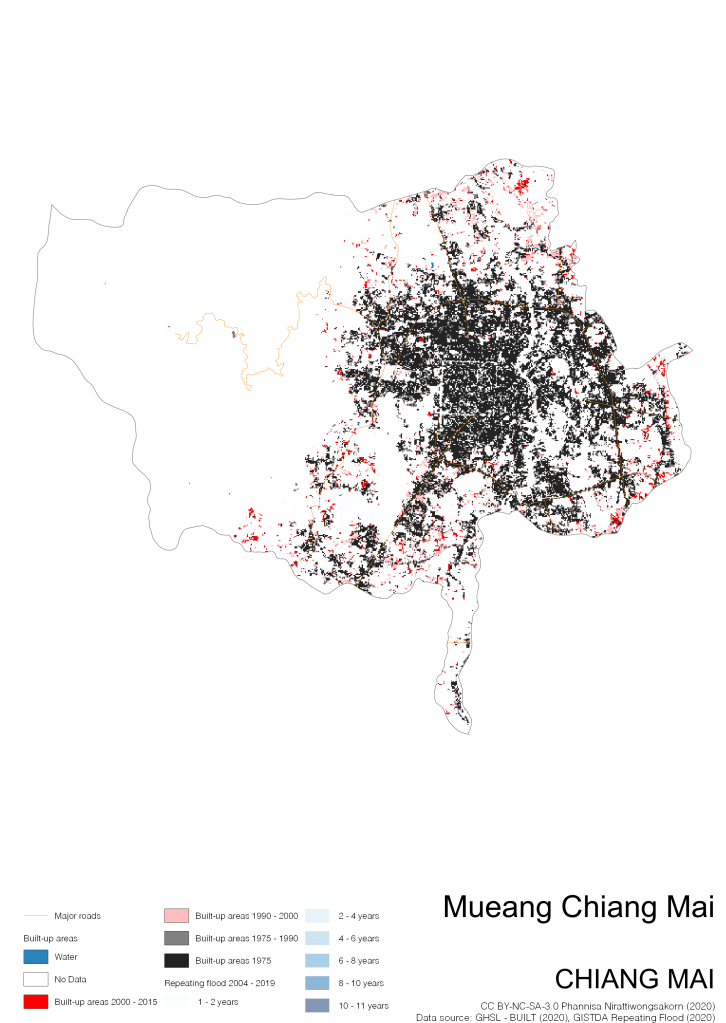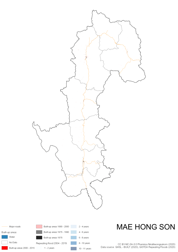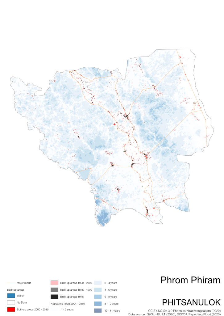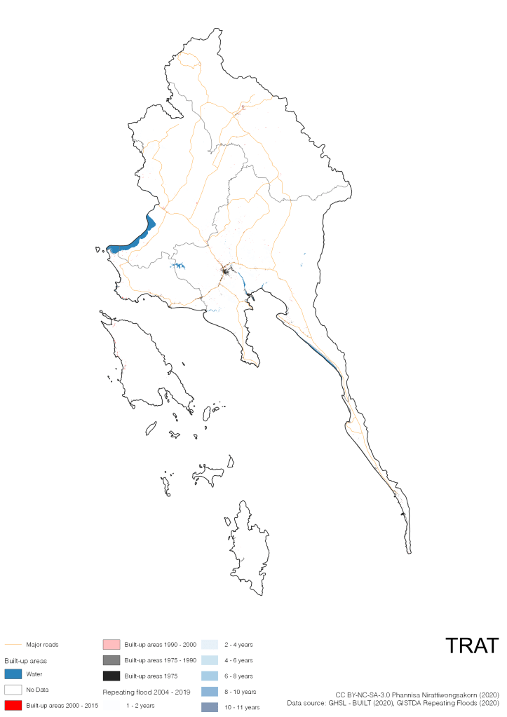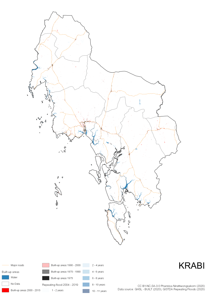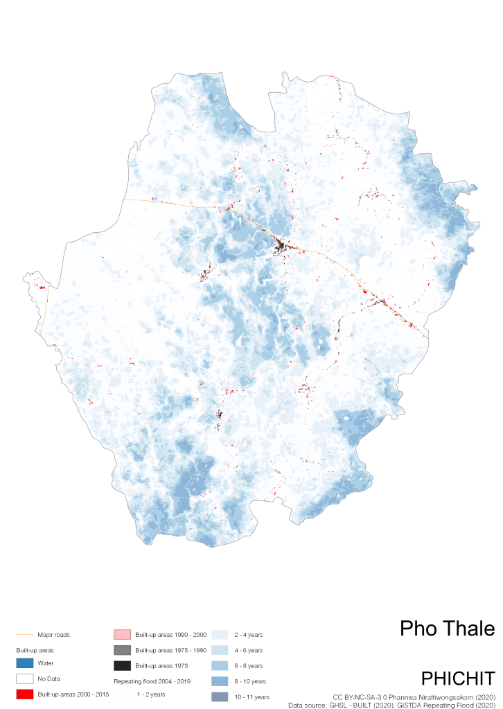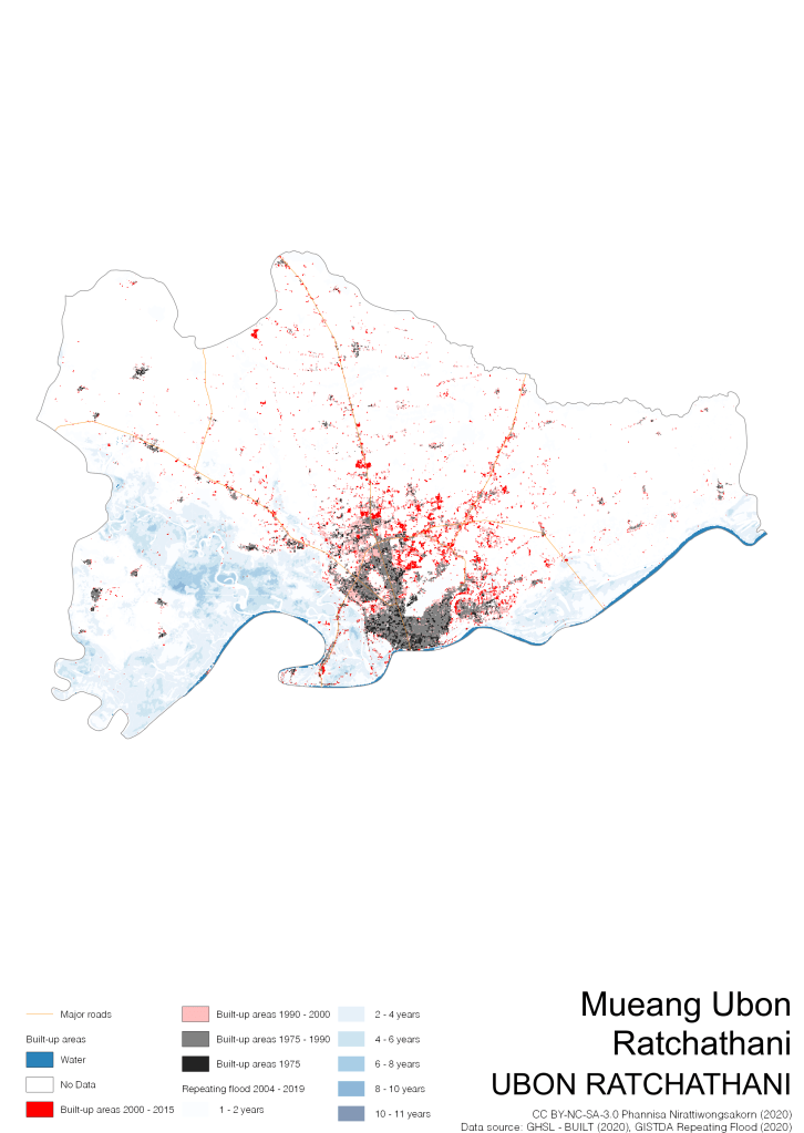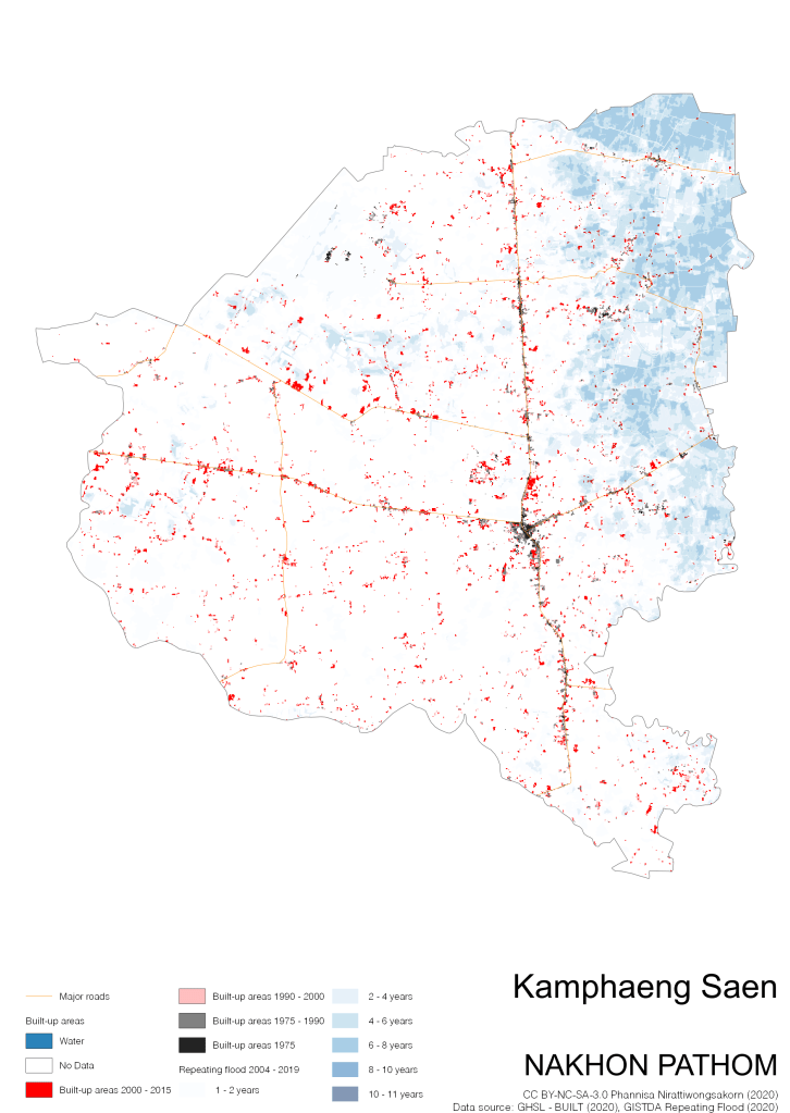On the continuation of Thailand’s Built-up Areas 1975 – 2015 Visualization which show built-up areas of the 4 periods: until 1975, 1975 – 1990, 1990 – 2000, and 2000 – 2015, by province and by district (Amphoe); I add annual repeating flood layer of 2004 – 2019 (GISTDA, 2020) to the current visualization. According to UNDP (2020), Thailand is susceptible to extreme weather events such as tropical storms, floods and drought because of climate change. With the fact that Thai settlements are usually close to rivers and shorelines, the highest repeating flooding, calculated from GISTDA dataset, is 11 out of 15 years. Here you will see many cities with high flood risks.