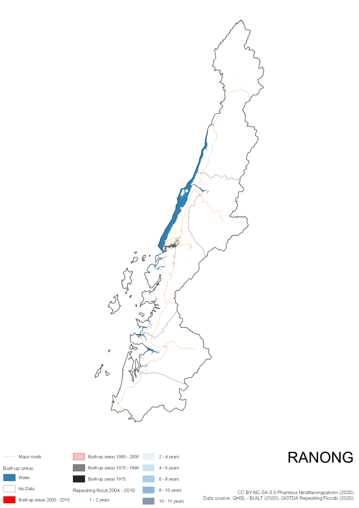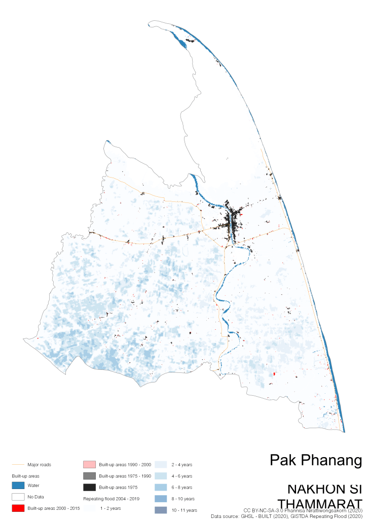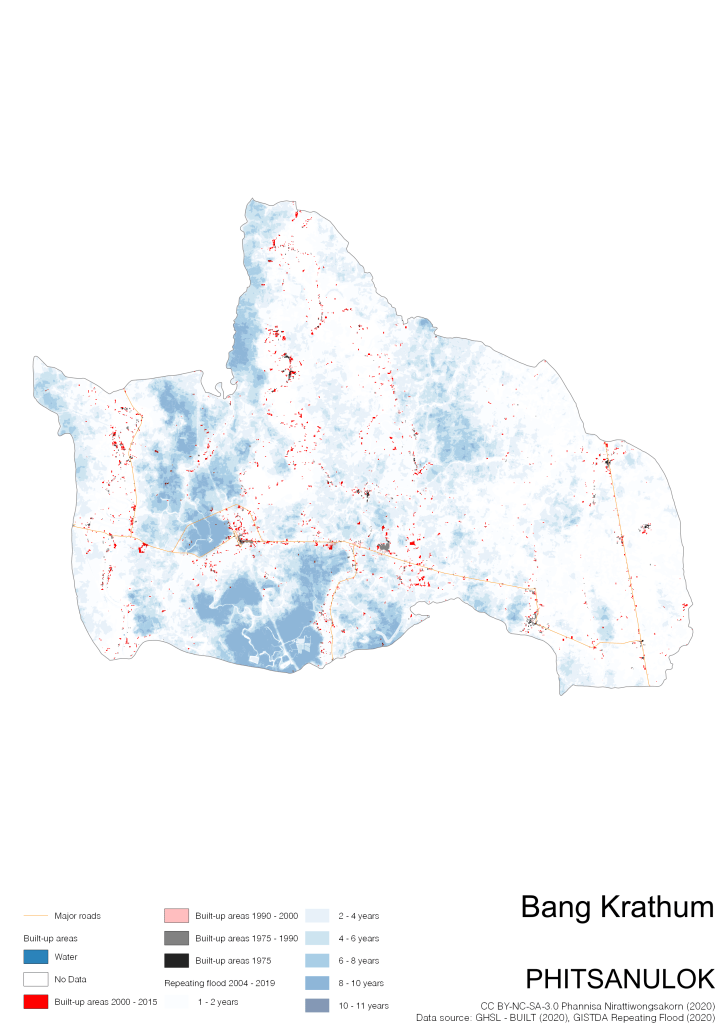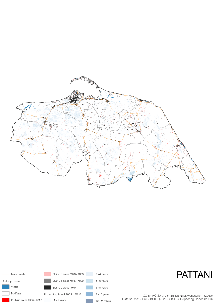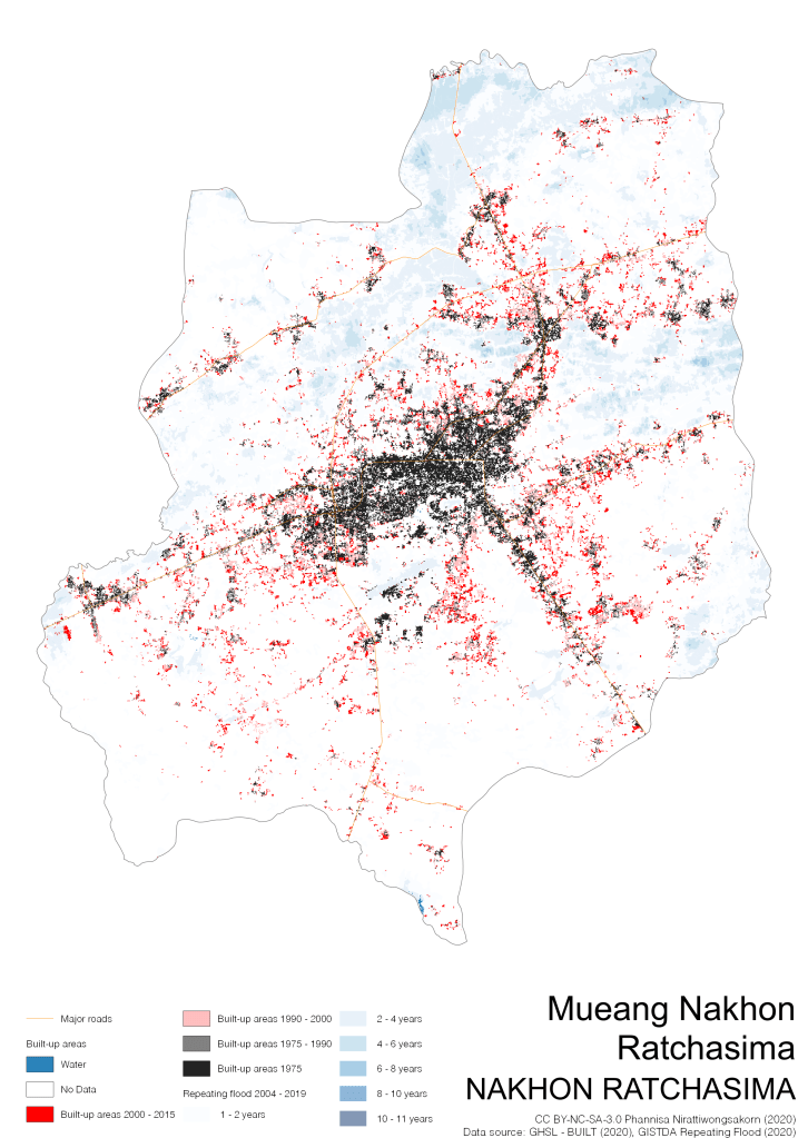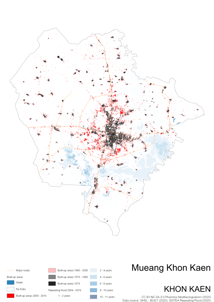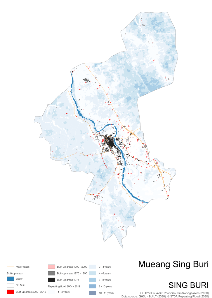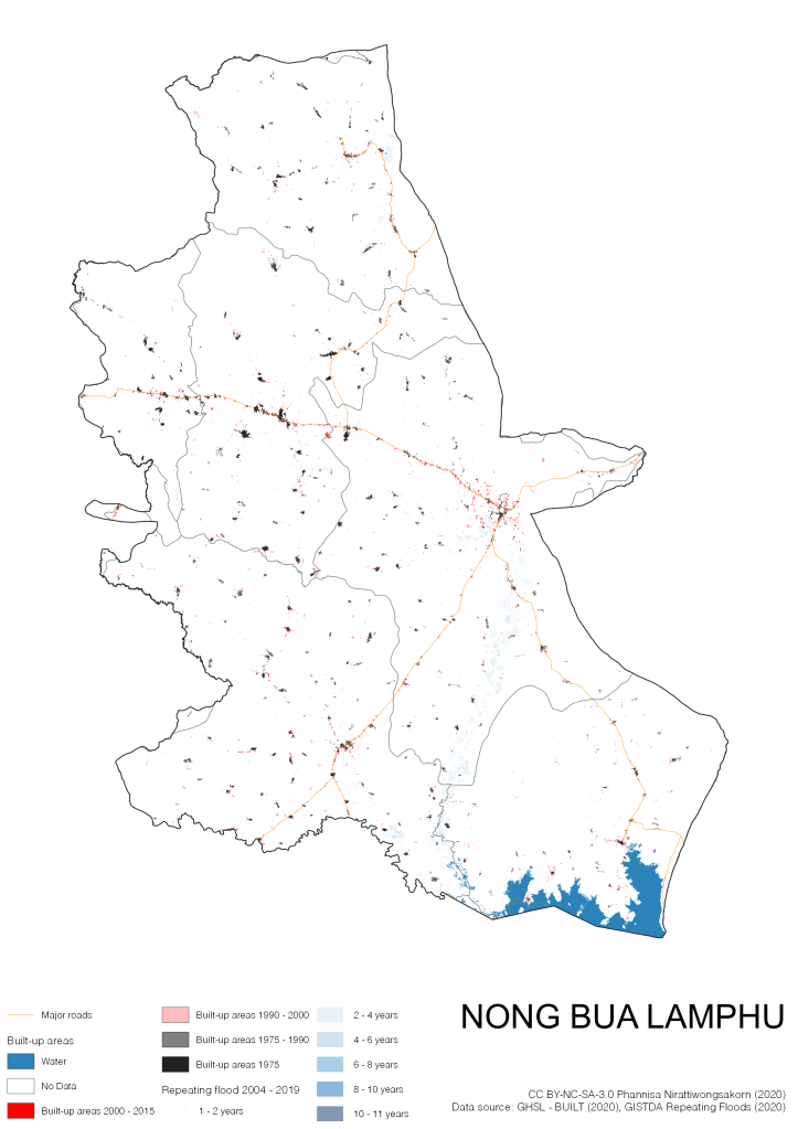 On the continuation of Thailand’s Built-up Areas 1975 – 2015 Visualization which show built-up areas of the 4 periods: until 1975, 1975 – 1990, 1990 – 2000, and 2000 – 2015, by province and by district (Amphoe); I add annual repeating flood layer of 2004 – 2019 (GISTDA, 2020) to the current visualization. According to UNDP (2020), Thailand is susceptible to extreme weather events such as tropical storms, floods and drought because of climate change. With the fact that Thai settlements are usually close to rivers and shorelines, the highest repeating flooding, calculated from GISTDA dataset, is 11 out of 15 years. Here you will see many cities with high flood risks.