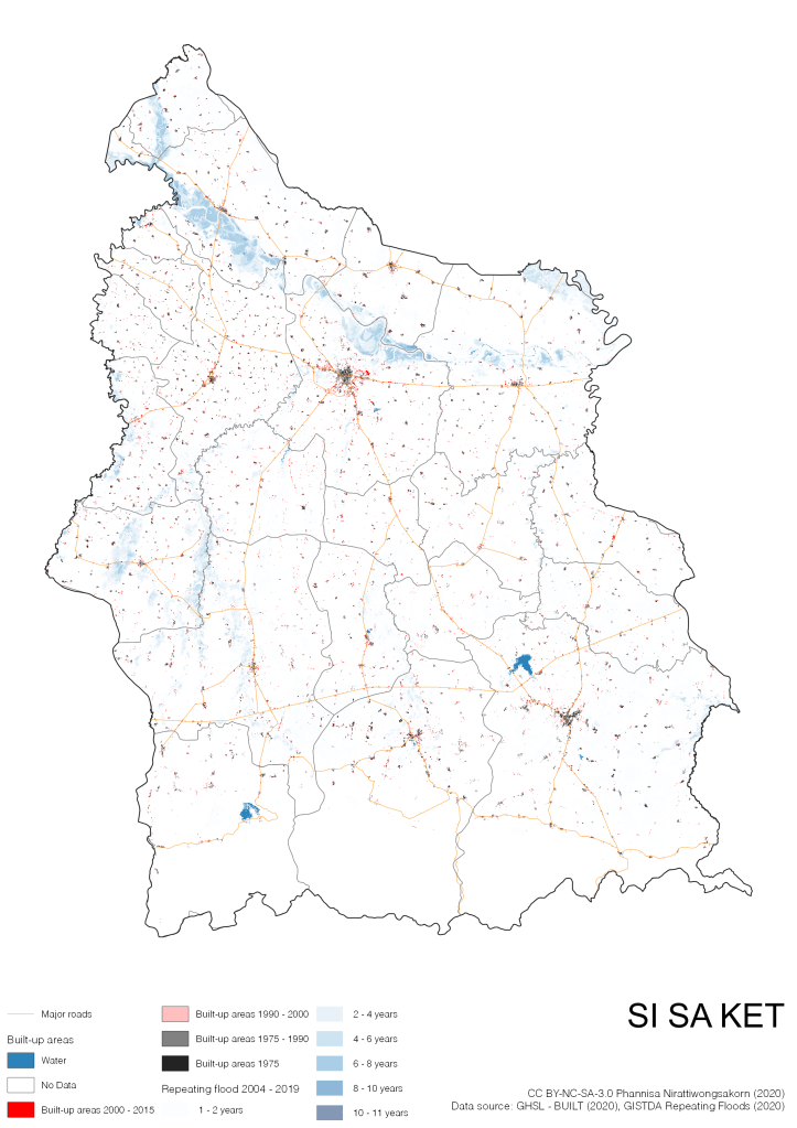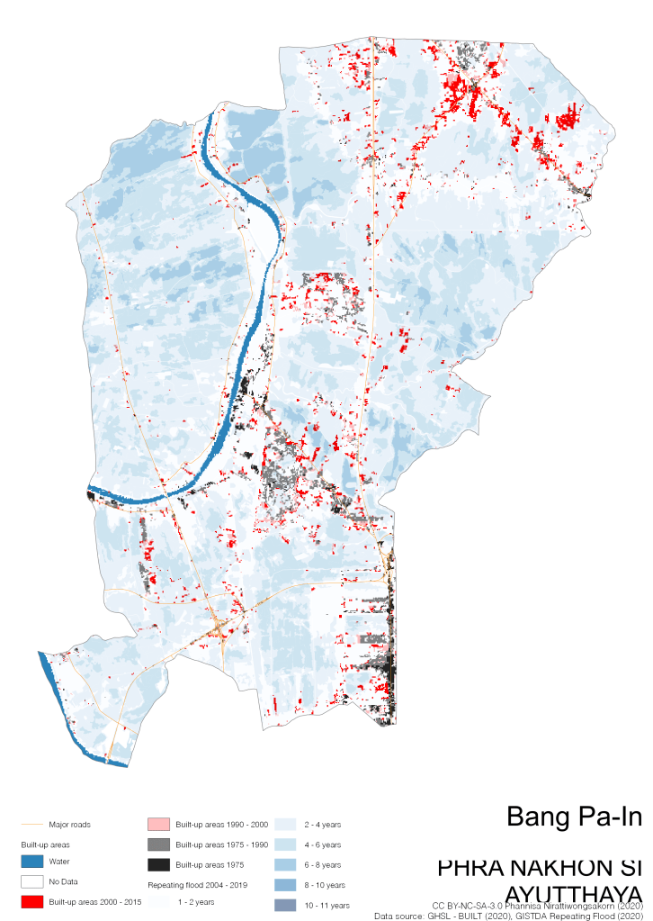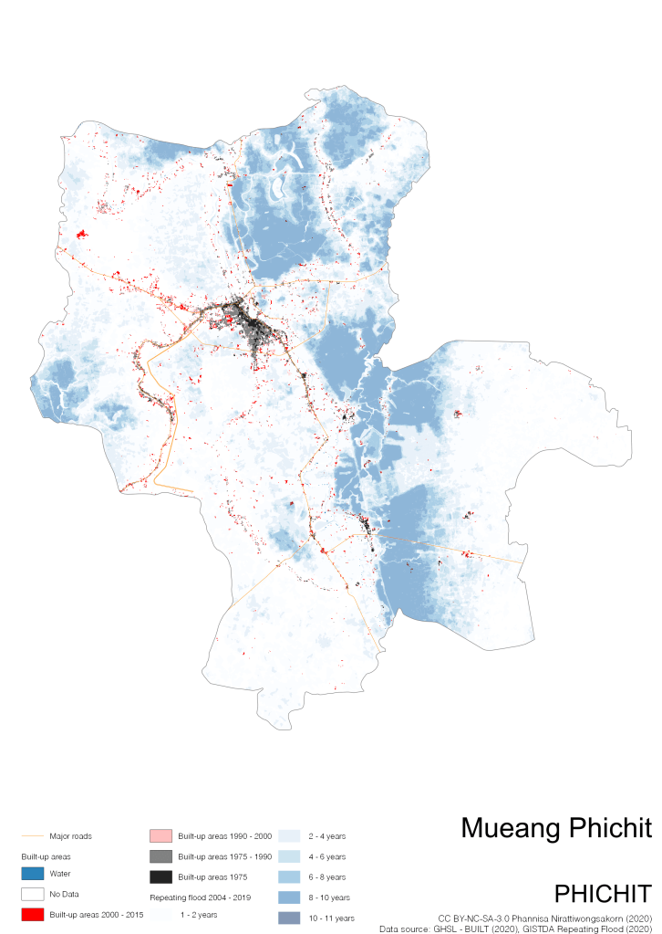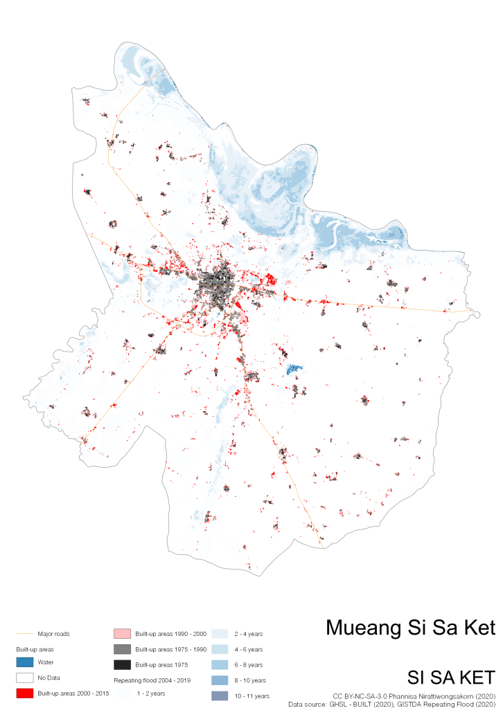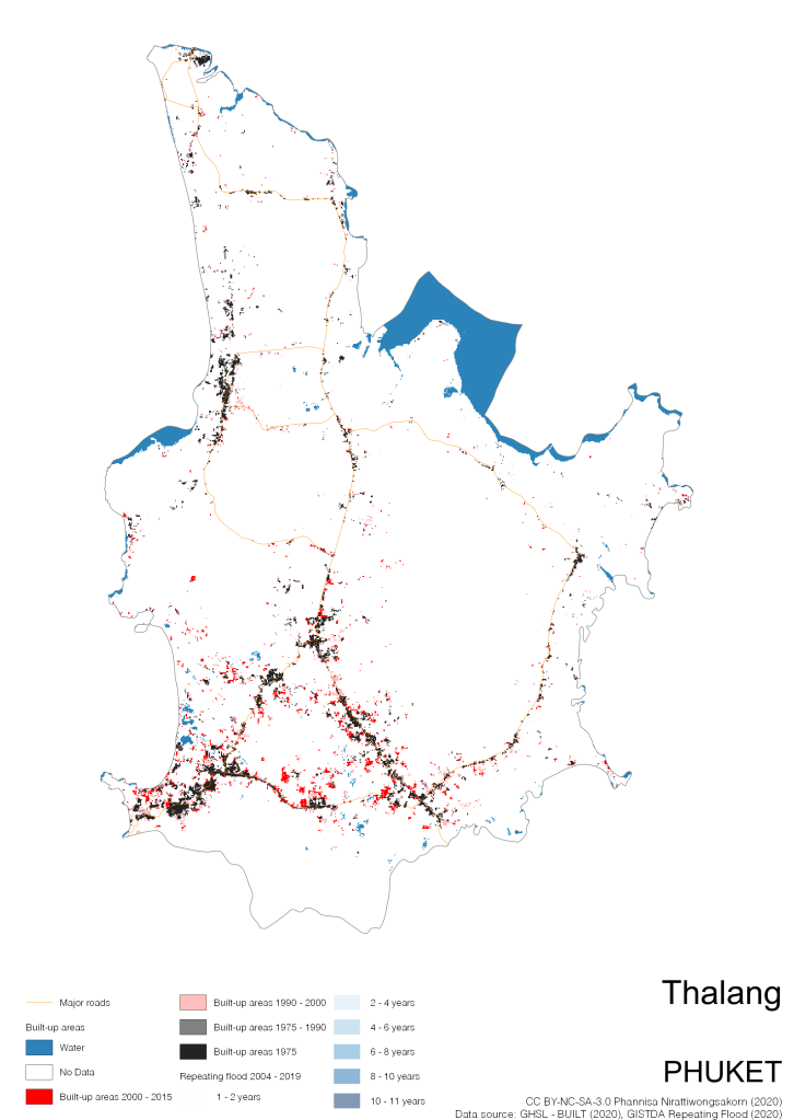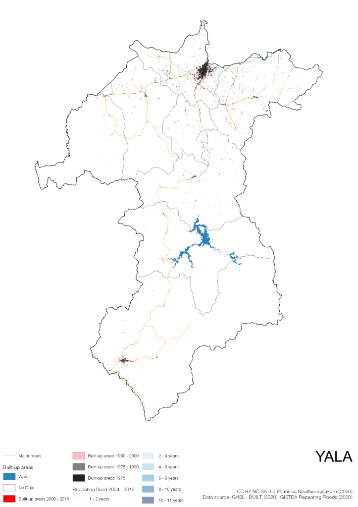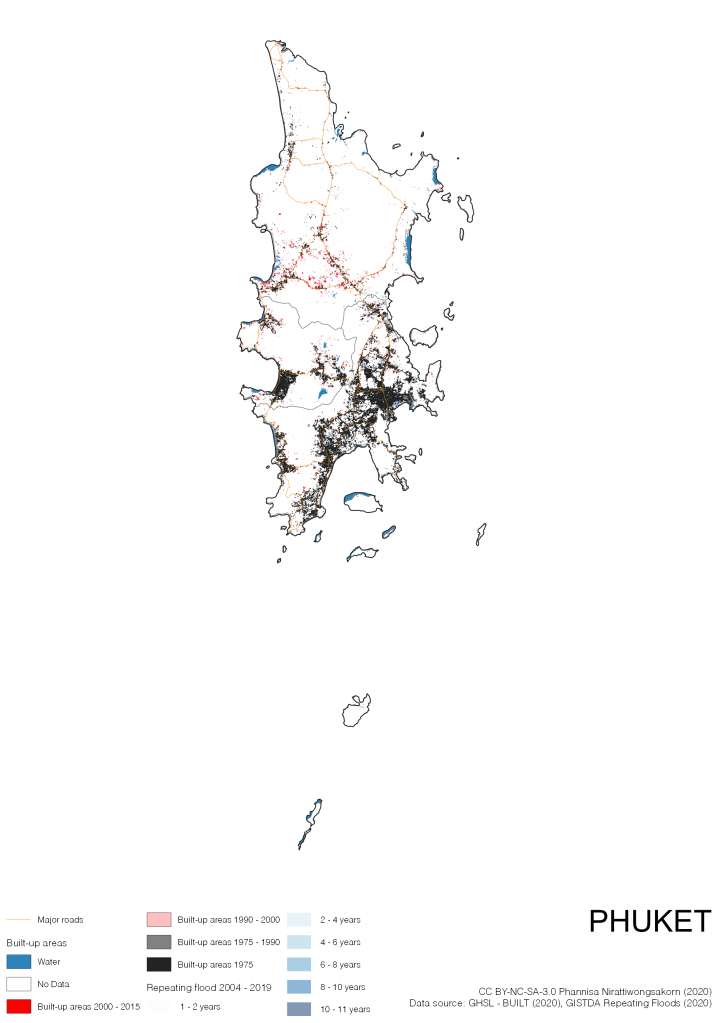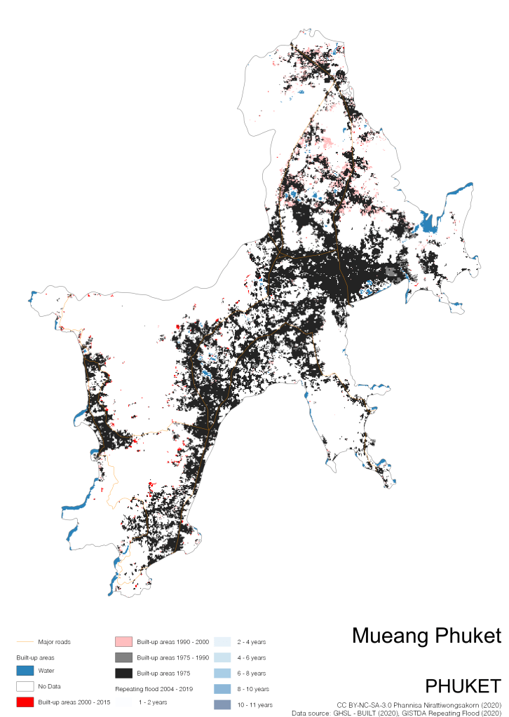 On the continuation of Thailand’s Built-up Areas 1975 – 2015 Visualization which show built-up areas of the 4 periods: until 1975, 1975 – 1990, 1990 – 2000, and 2000 – 2015, by province and by district (Amphoe); I add annual repeating flood layer of 2004 – 2019 (GISTDA, 2020) to the current visualization. According to UNDP (2020), Thailand is susceptible to extreme weather events such as tropical storms, floods and drought because of climate change. With the fact that Thai settlements are usually close to rivers and shorelines, the highest repeating flooding, calculated from GISTDA dataset, is 11 out of 15 years. Here you will see many cities with high flood risks.