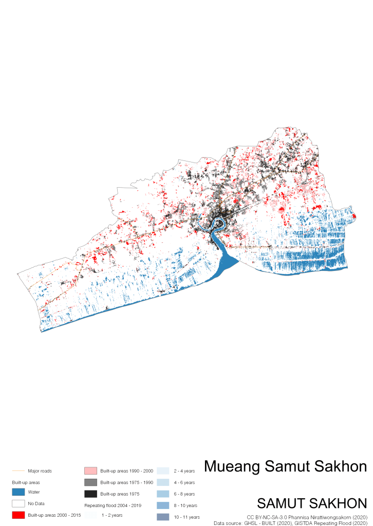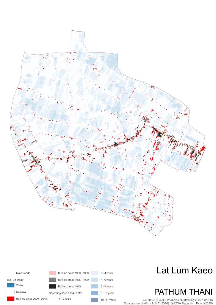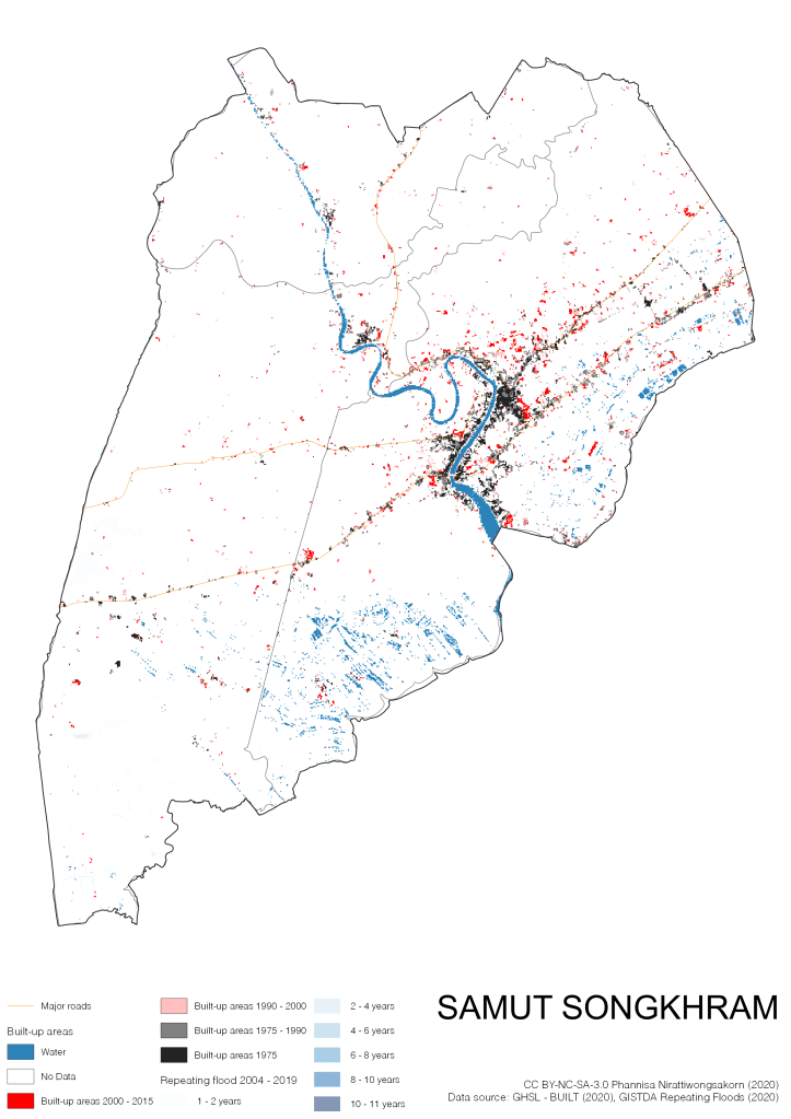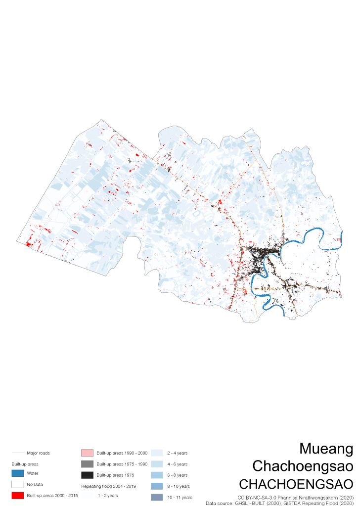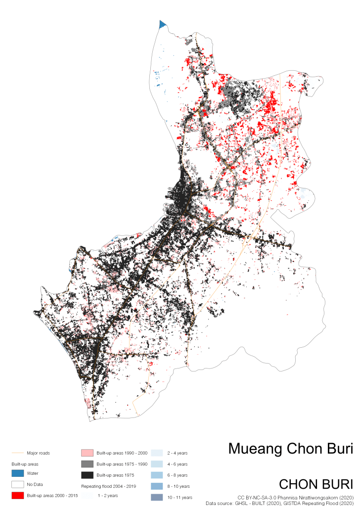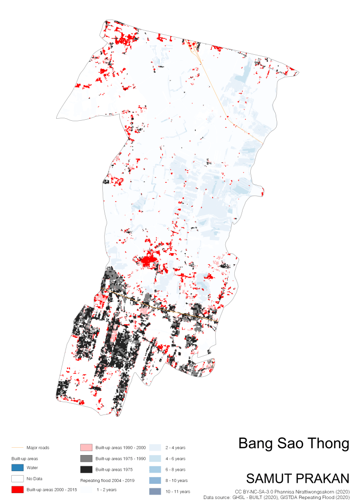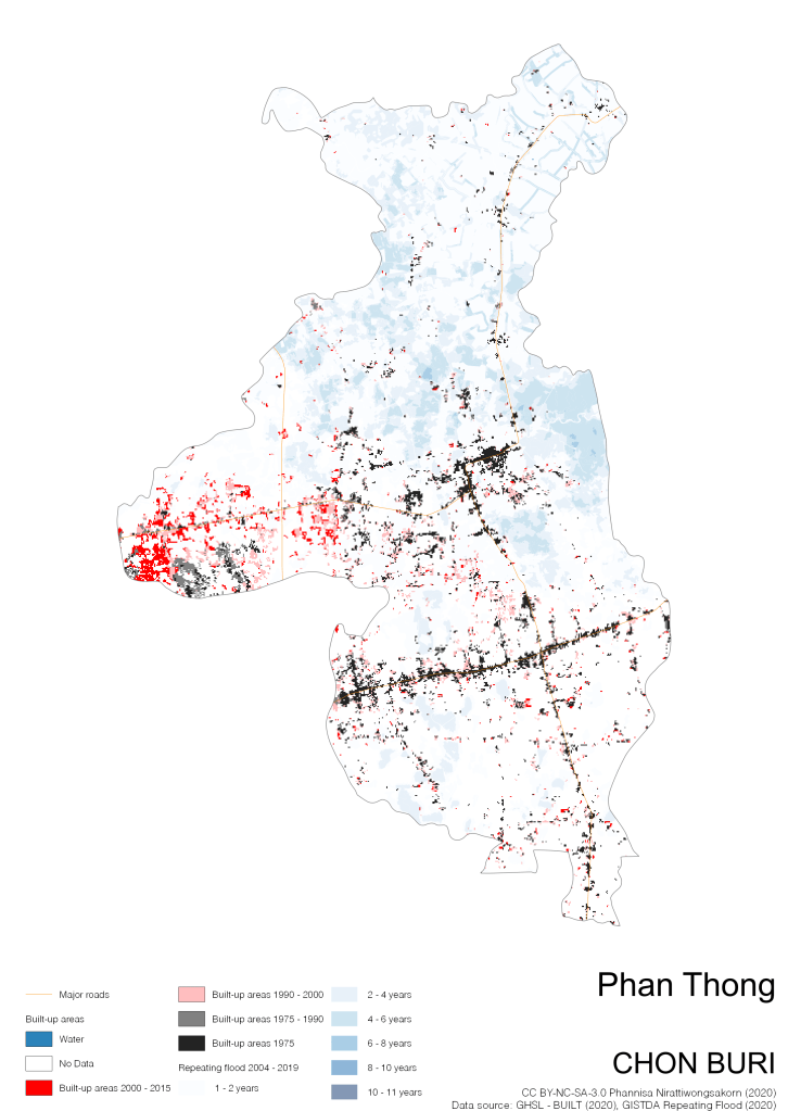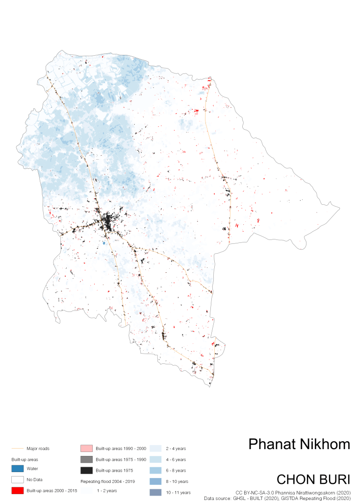 Data source: (1) European Commission’s Global Human Settlement Layer (GHSL) – BUILT (2020); (2) GISTDA Repeating Floods 2004 – 2019