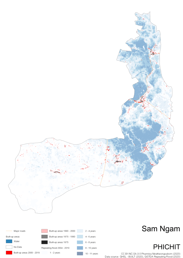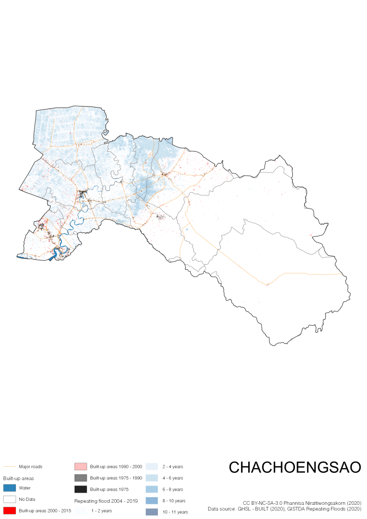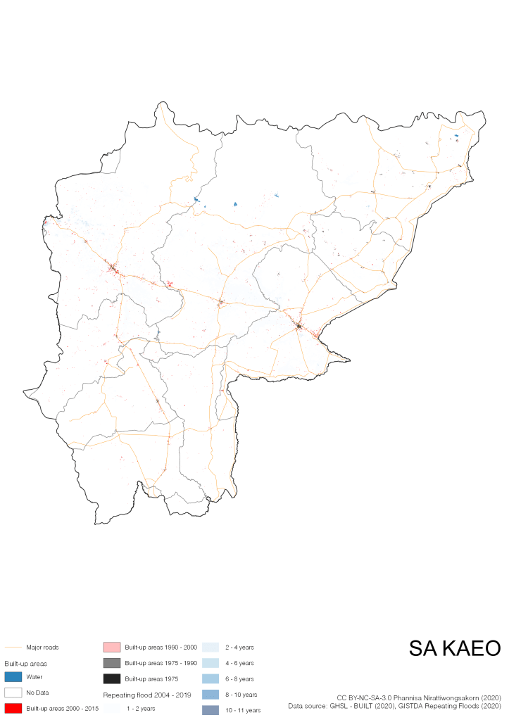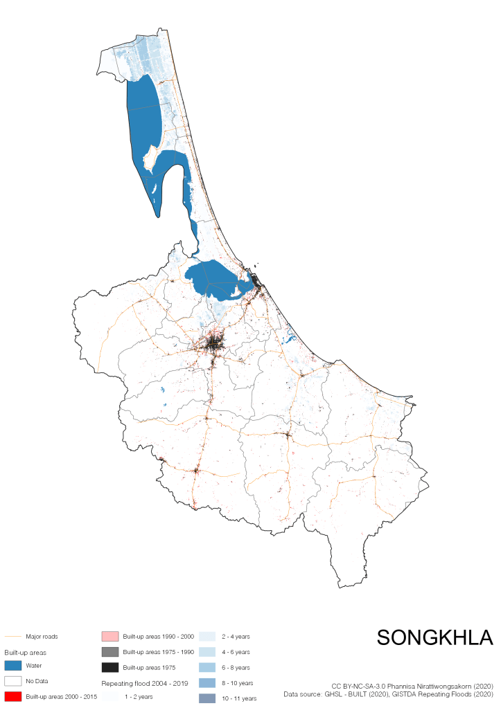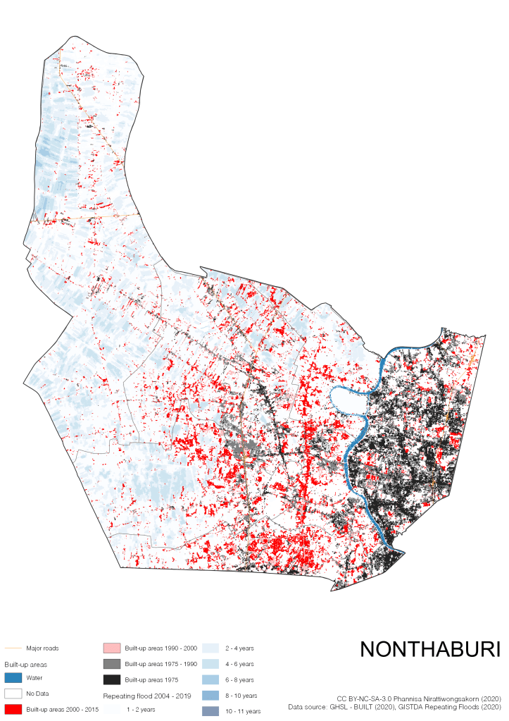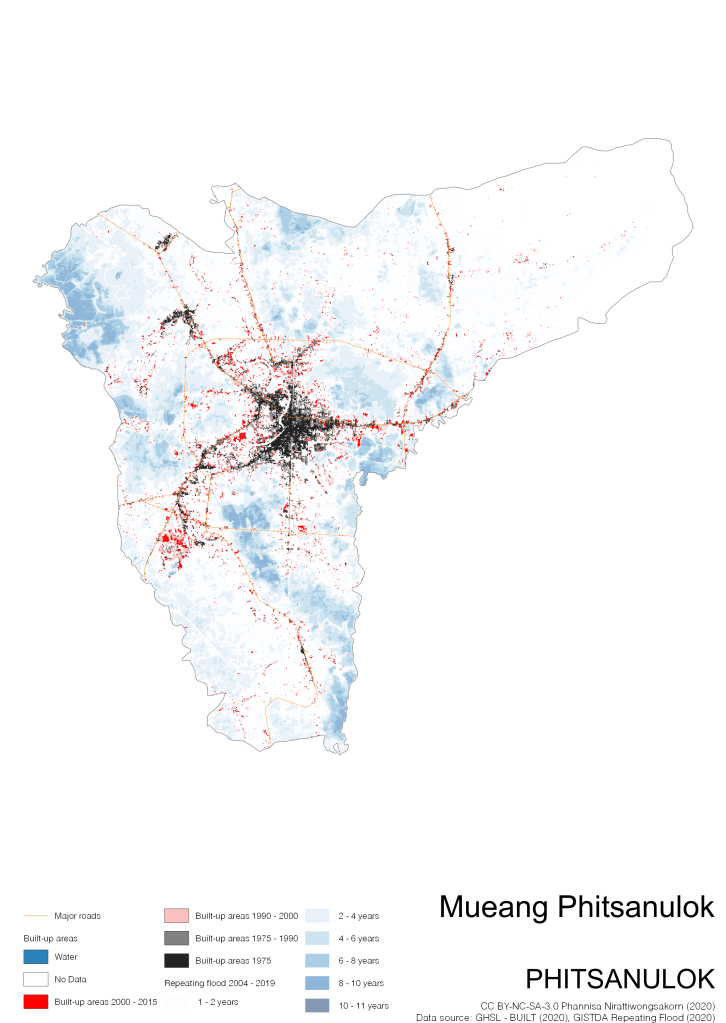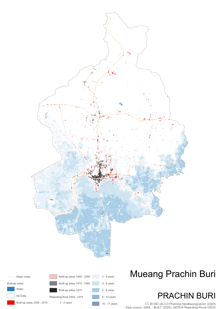 Data source: (1) European Commission’s Global Human Settlement Layer (GHSL) – BUILT (2020); (2) GISTDA Repeating Floods 2004 – 2019
