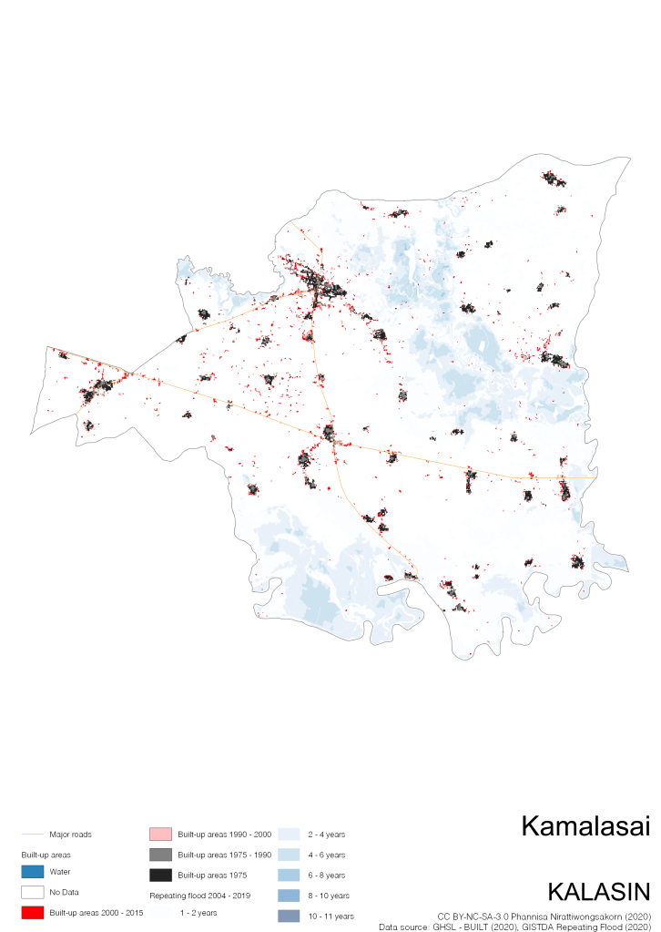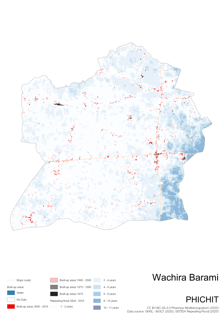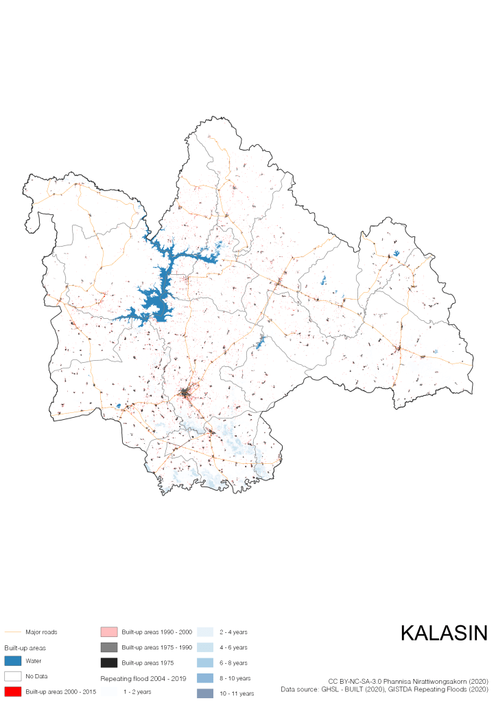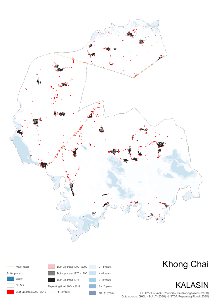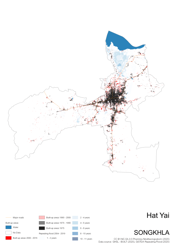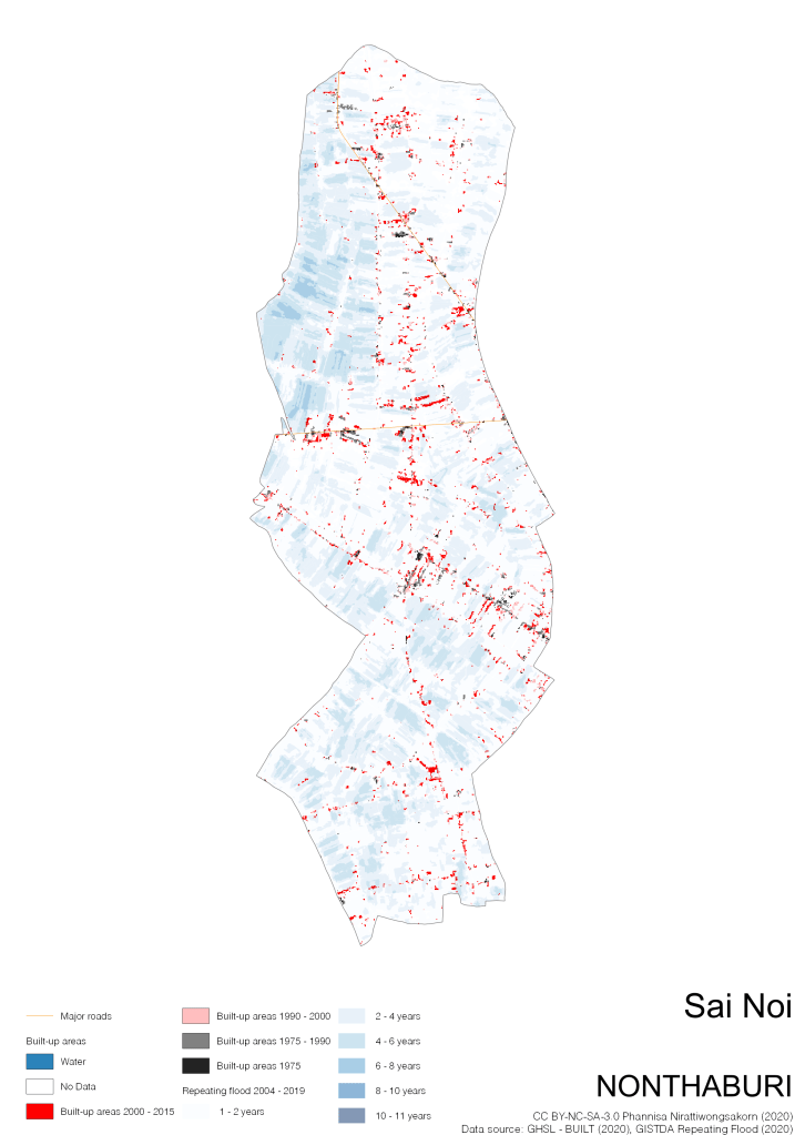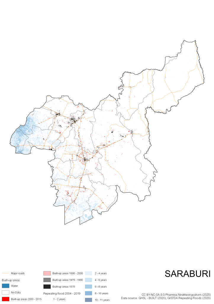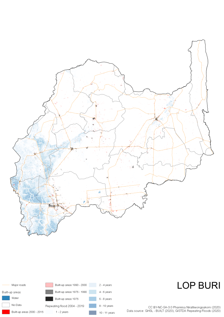 Data source: (1) European Commission’s Global Human Settlement Layer (GHSL) – BUILT (2020); (2) GISTDA Repeating Floods 2004 – 2019