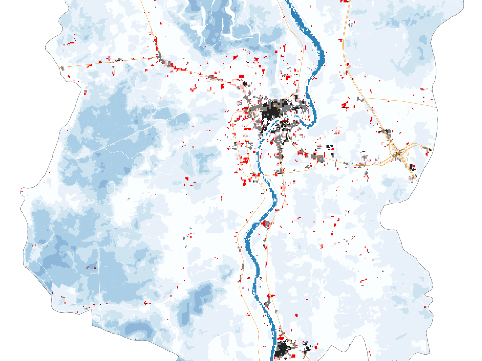 - Blue color ramp: annual repeating flood areas between 2004 – 2019, darker tone indicates higher degree (more years) of repeating floods