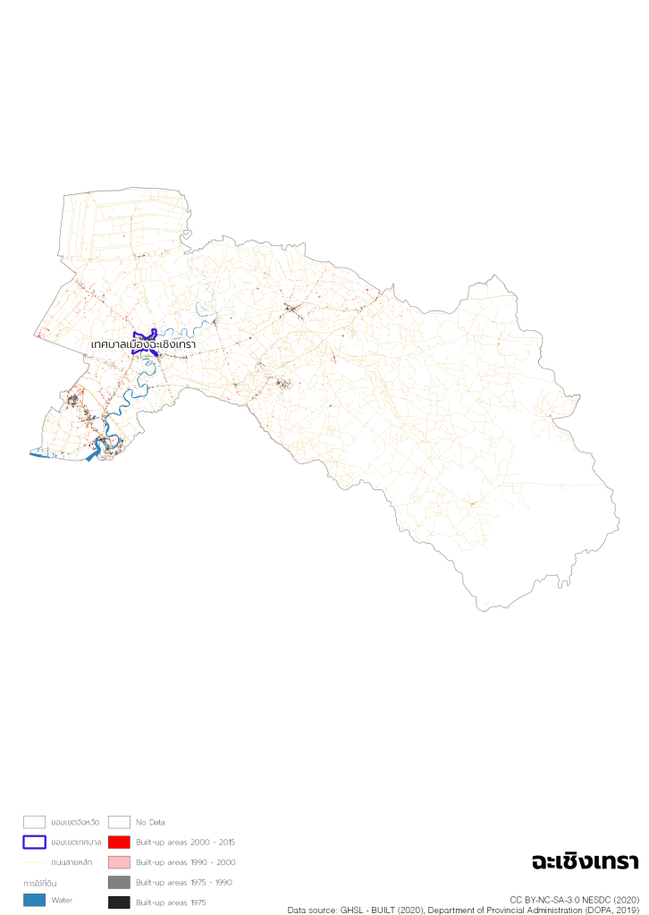 Tessaban Nakhon and Tessaban Mueang are used as the proxies of urban areas in accordance with their minimum population requirements of 10,000 (Tessaban Mueang) and 50,000 (Tessaban Nakhon) under the Municipal Act (No. 14) B.E. 2562 of Thailand. The GIS layer (shapefile) of Tessaban boundaries is collected by reviewing the official Tessaban foundation annoucements, and aggregating Tessaban boundaries from Tambon (Sub-district) boundaries as a base layer. Tambon layer is used as a base layer because it is the smallest administration unit available in Shapefile format. However, there are few Tessabans which their boundaries cover only a part of Tambon. In this case, we consider the whole Tambon as the Tessaban.