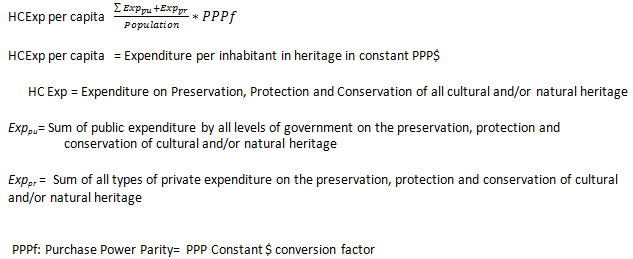 UN Metadata: The indicator is calculated by dividing total public funding in heritage (i.e. including transfers paid but excluding transfers received) from government (central, regional, local) and the total of private funding from households, other private sources such as donations, sponsorships or international sources in a given year by the number of inhabitants and by the PPP$ conversion factor.