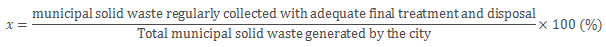 UN Metadata: The numerator of this indicator is ‘municipal solid waste regularly collected with adequate final treatment and disposal’ and the denominator is ‘total municipal solid waste generated by the city’.