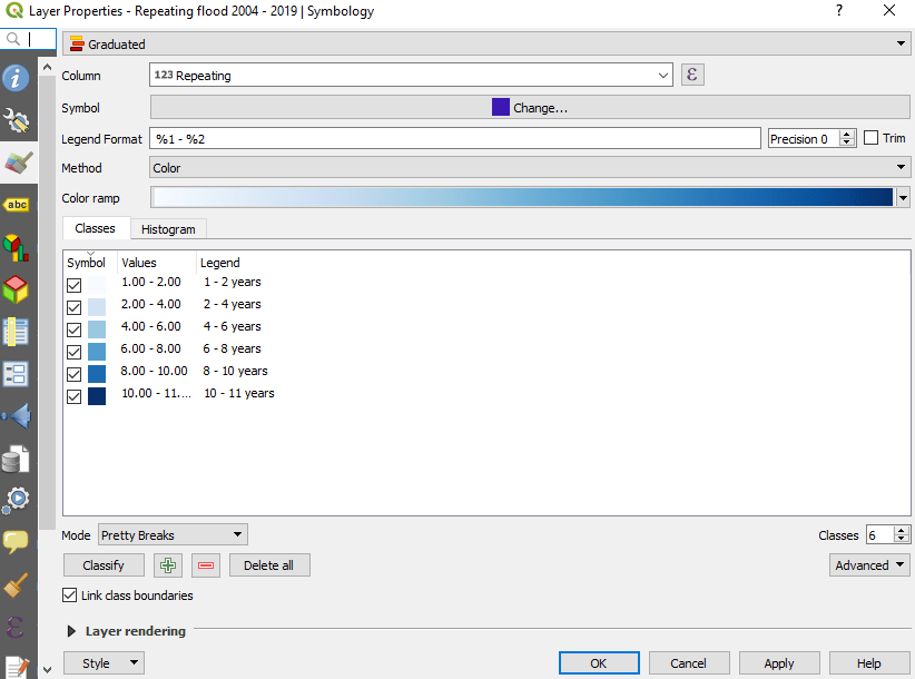 Repeating floods are represented by number of years impacted by flooding of each area. The highest value is 11 years (from the possible max of 16 years which is very frequent). We want to visualize the frequency of flooding using color ramp, darker color indicates the higher frequency. It has to be noted that the repeating flood layer comes in vector format, so style setting is a little bit different from the former raster one.