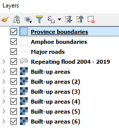 Load all layers into QGIS and arrange them as image (1). Because the global raster dataset is sliced into smaller tiles (by the provider), Thailand consists of 6 of them (the order among these tiles in our workspace doesn’t matter). It is possible to merge 6 rasters into 1, you can follow the instruction here. - Visualize built-up area layers (raster) (see image (2))